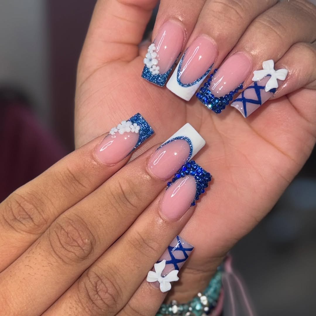 This is French tip energy with main-character confidence. The blue glitter accents and crystal detailing turn a classic base into something bold and fun.