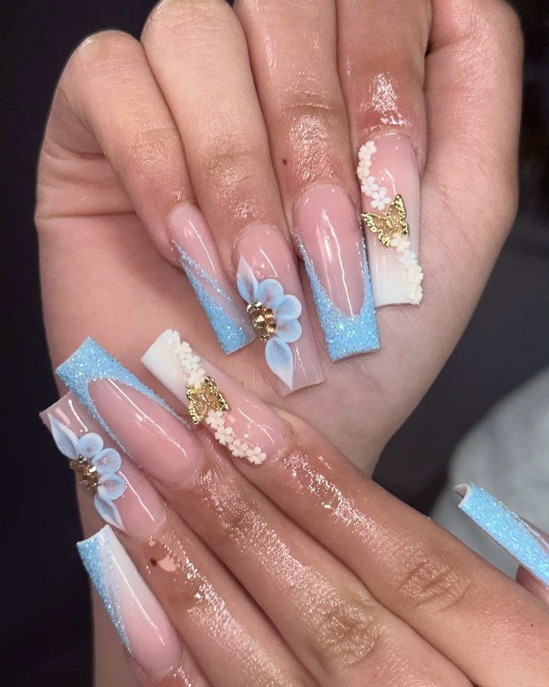Powdery blue tips and floral accents give this set a soft, romantic feel. There’s a sweetness here, but it’s balanced with structure so it doesn’t feel overly delicate.