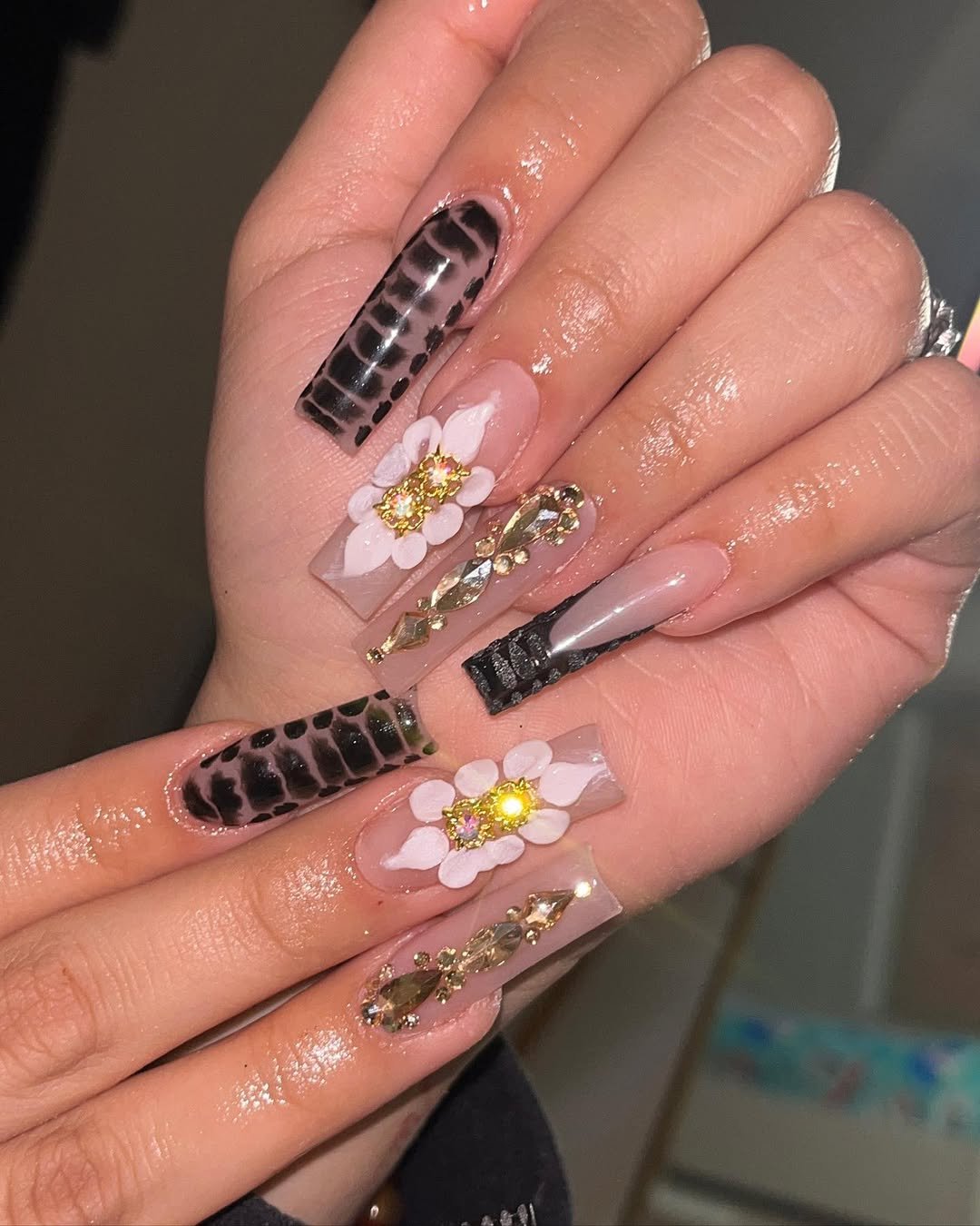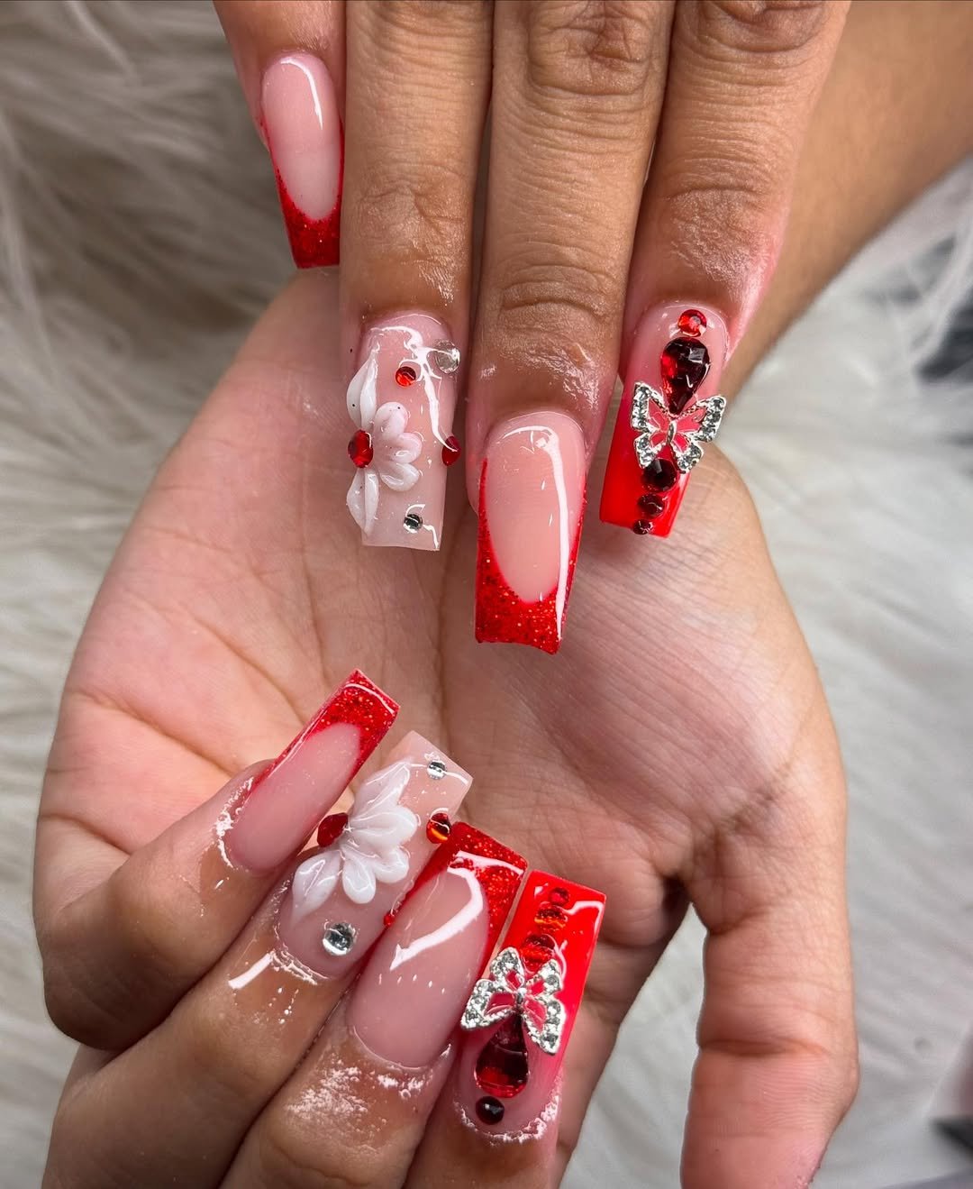 Classic red gets a prom-ready update here. Glossy crimson tips paired with sculpted florals and crystal accents feel bold, romantic, and unapologetically glam.