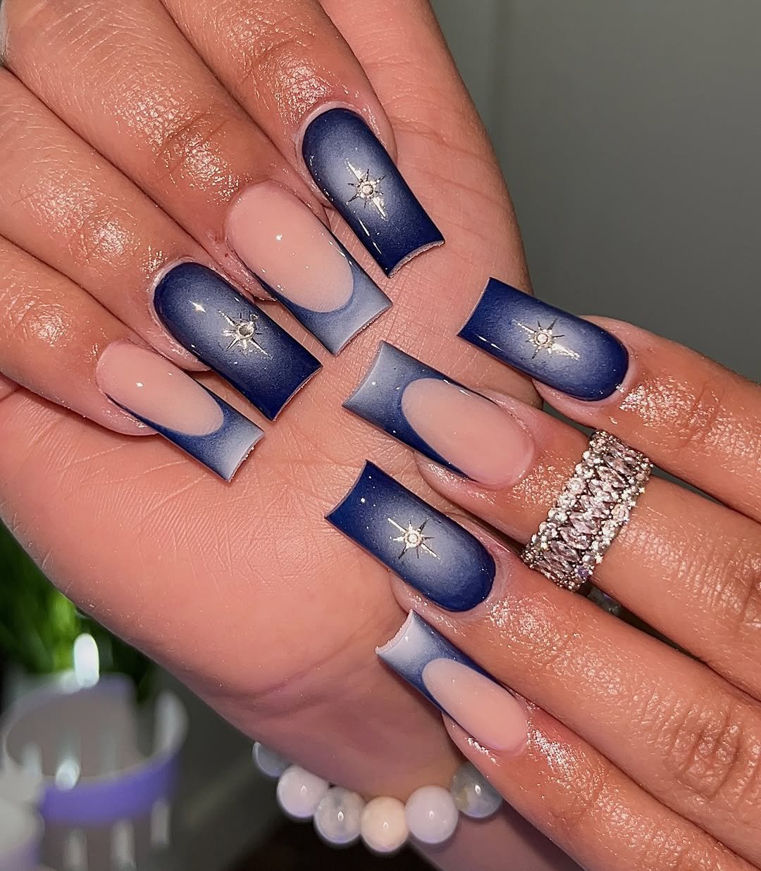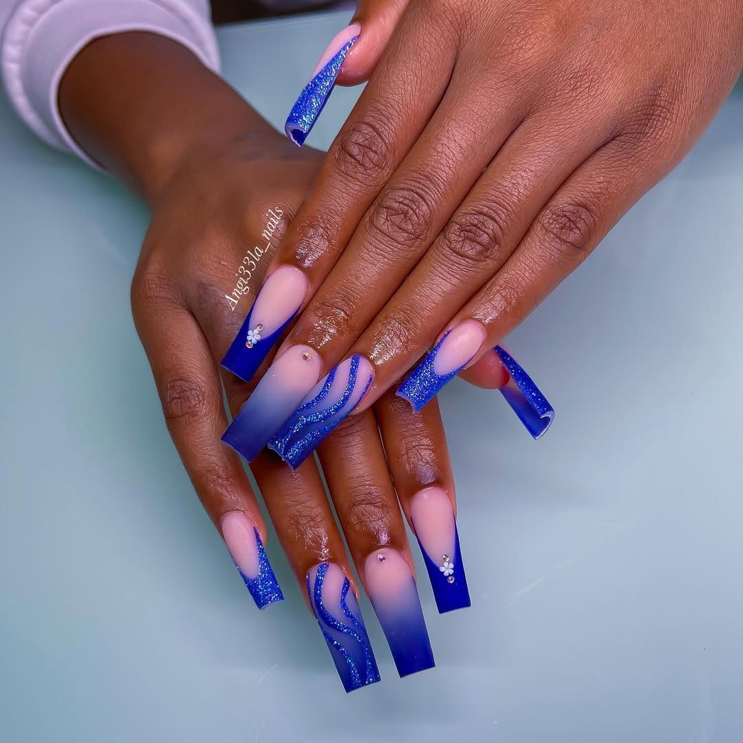 This set leans bold in the best way. A deep blue ombré melts into a soft blush base, with glitter lines that feel like motion frozen mid-dance. It’s confident, sleek, and made for photos.