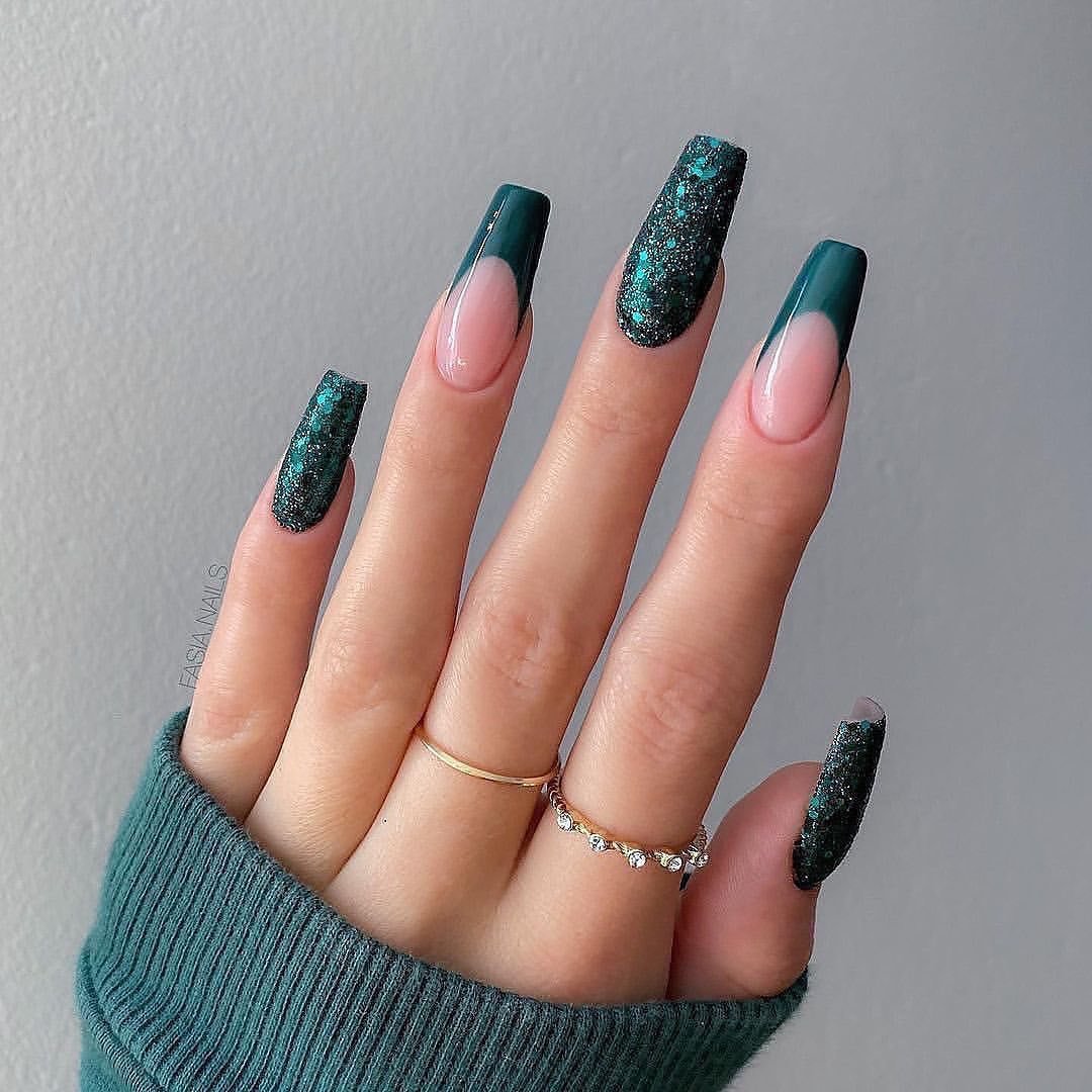 Deep green tips with a glossy finish give this set a bold, confident energy. The contrast between the natural base and that rich emerald tone feels sharp, modern, and very put-together.
