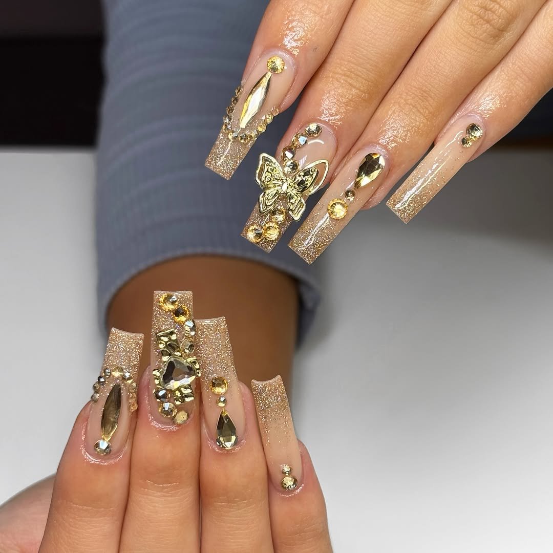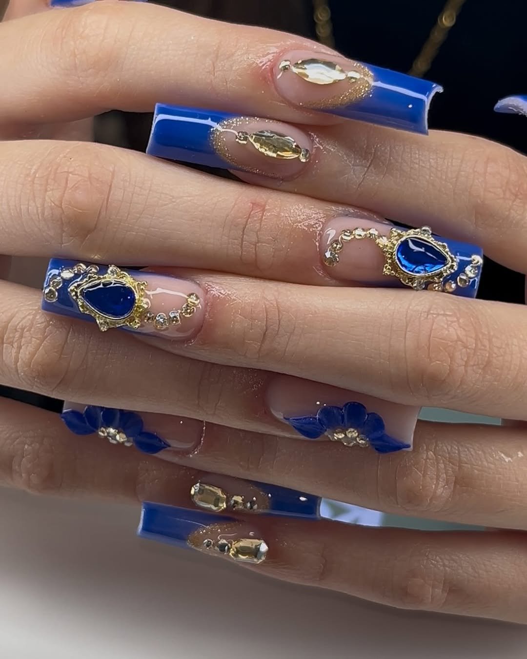 This is bold, unapologetic glam. The deep blue paired with gold detailing and crystals gives full luxury energy, like jewelry—but on your nails.