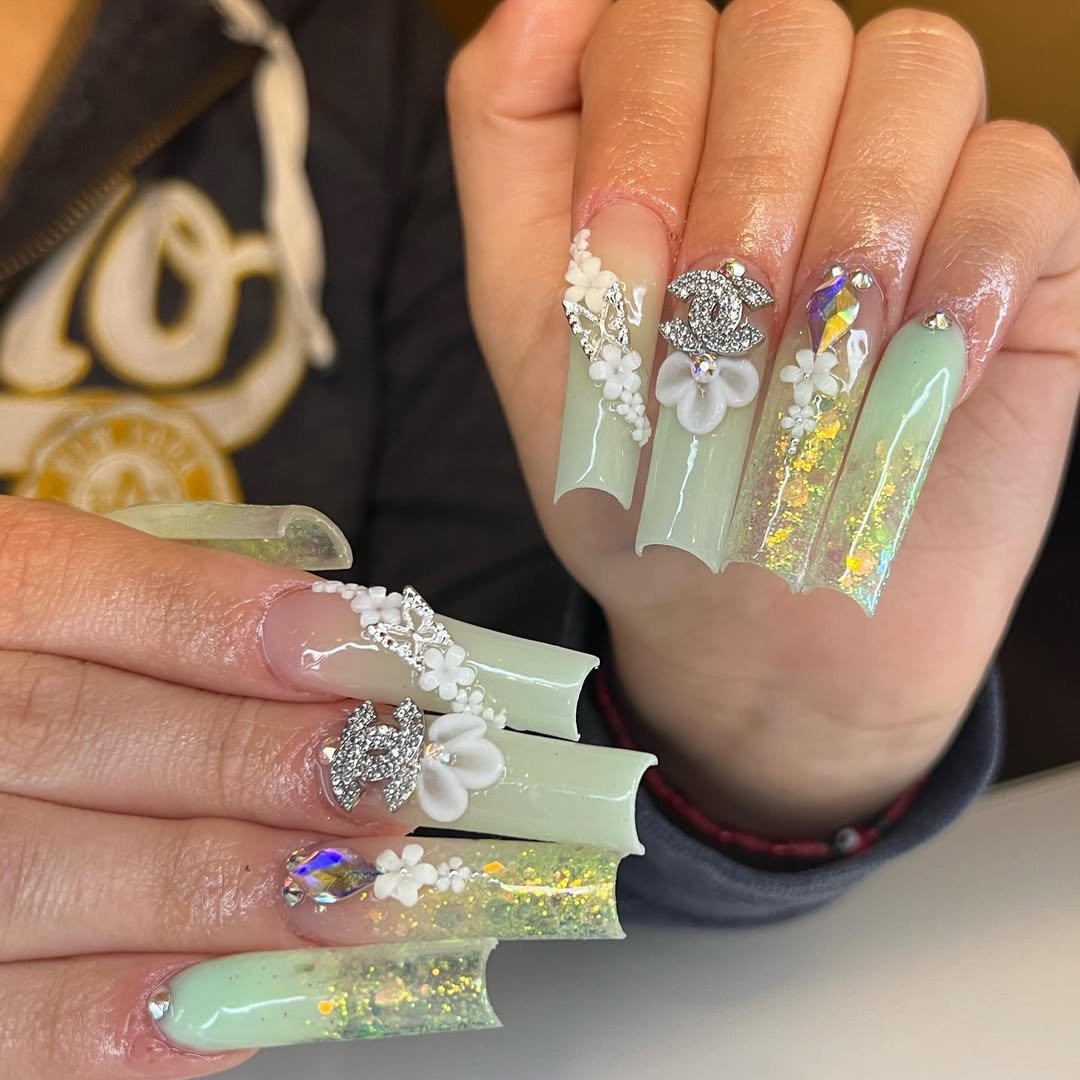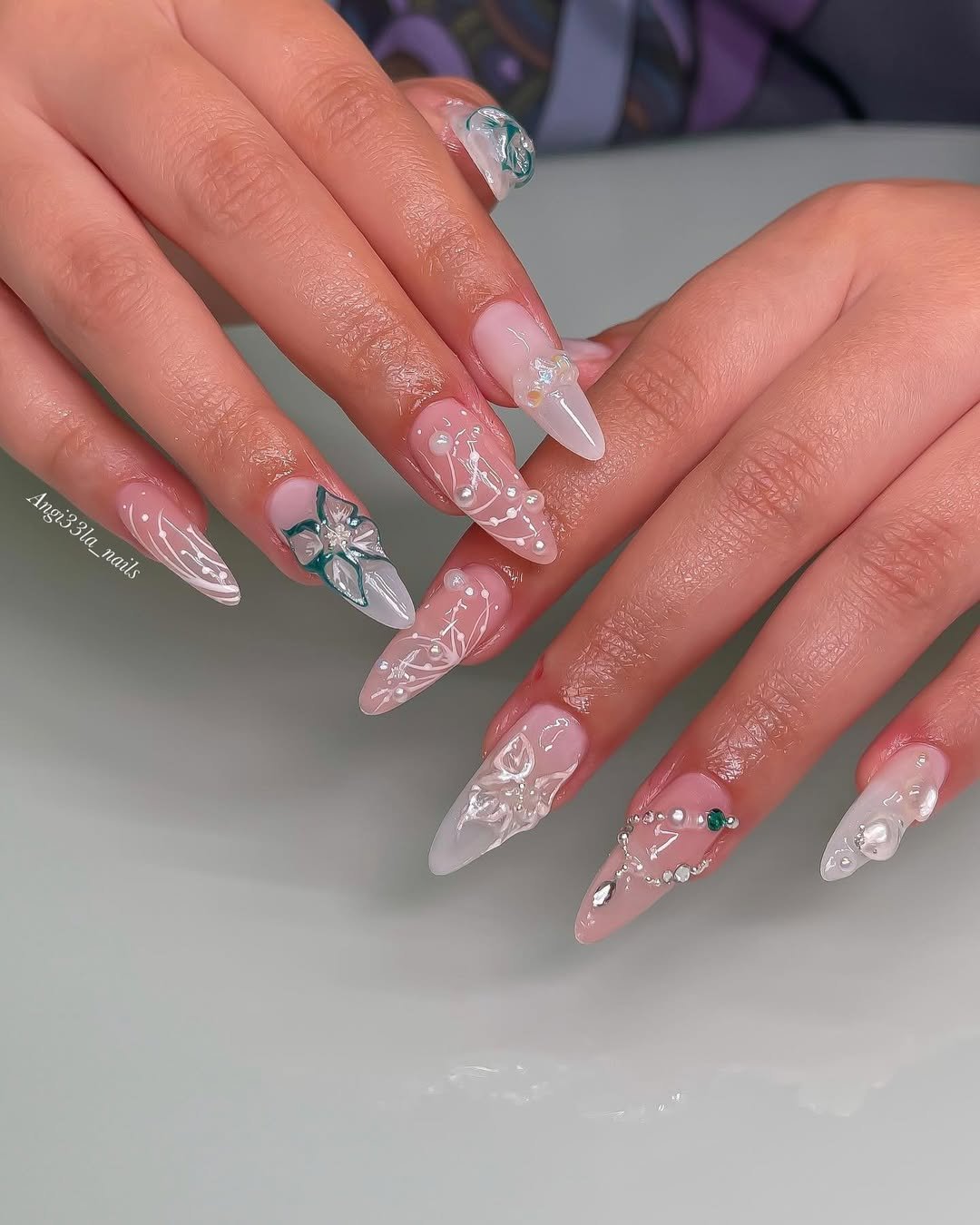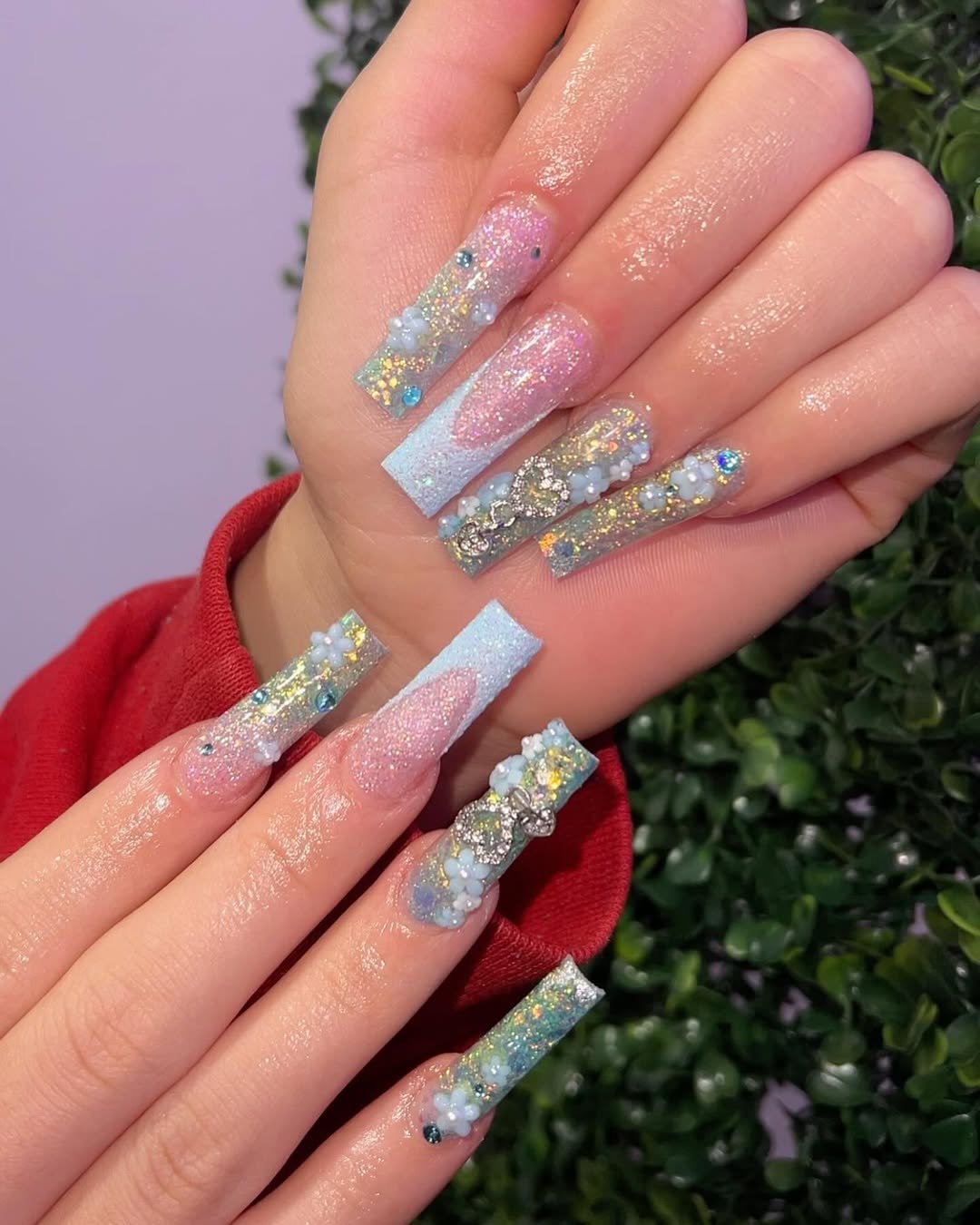These nails feel like winter magic in motion. The icy blue tones mixed with shimmer and tiny embellishments give serious fairycore vibes.