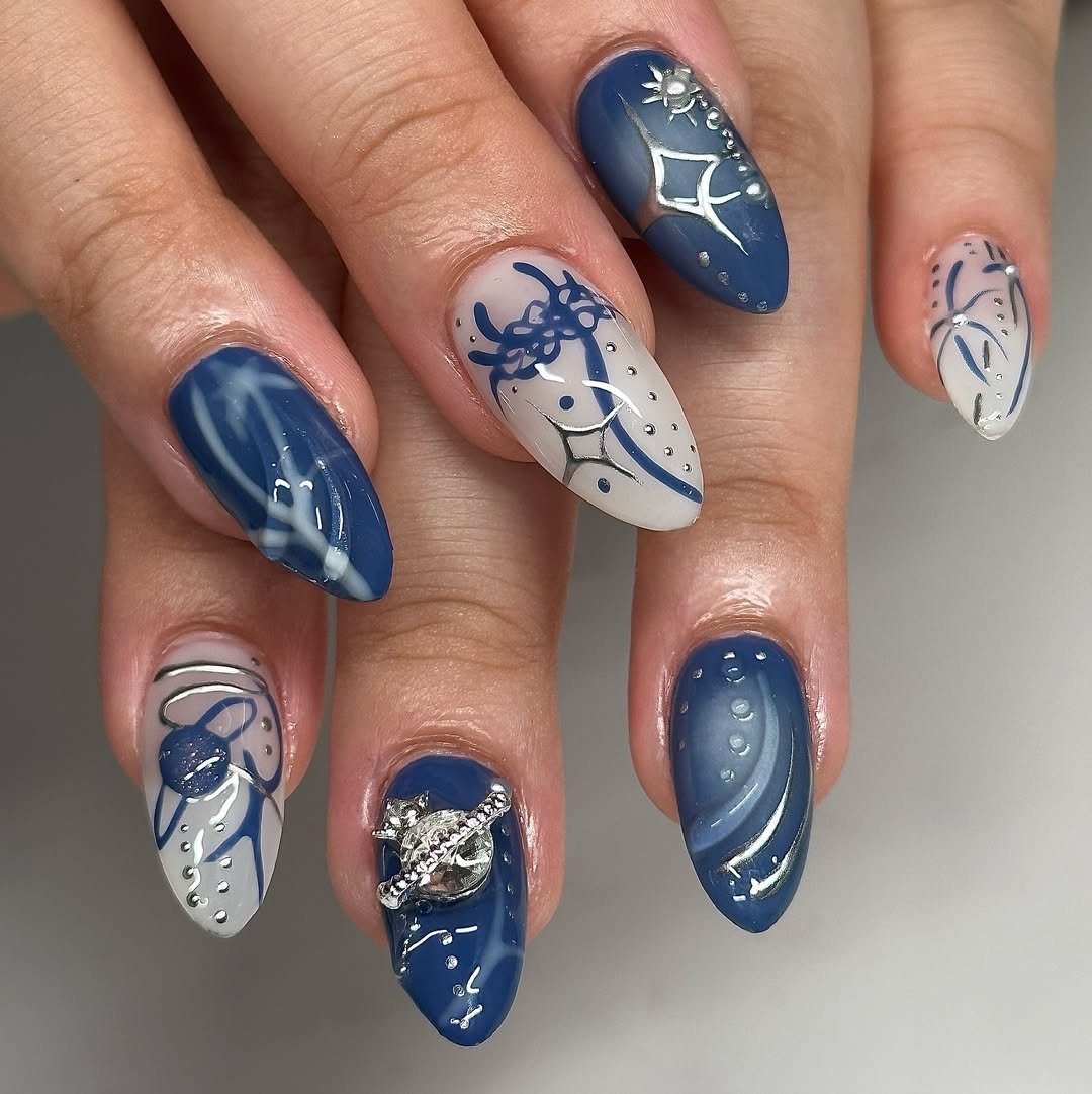 Deep navy tones mixed with hand-drawn detailing create a look that feels moody and artistic. It’s less sparkle, more statement.