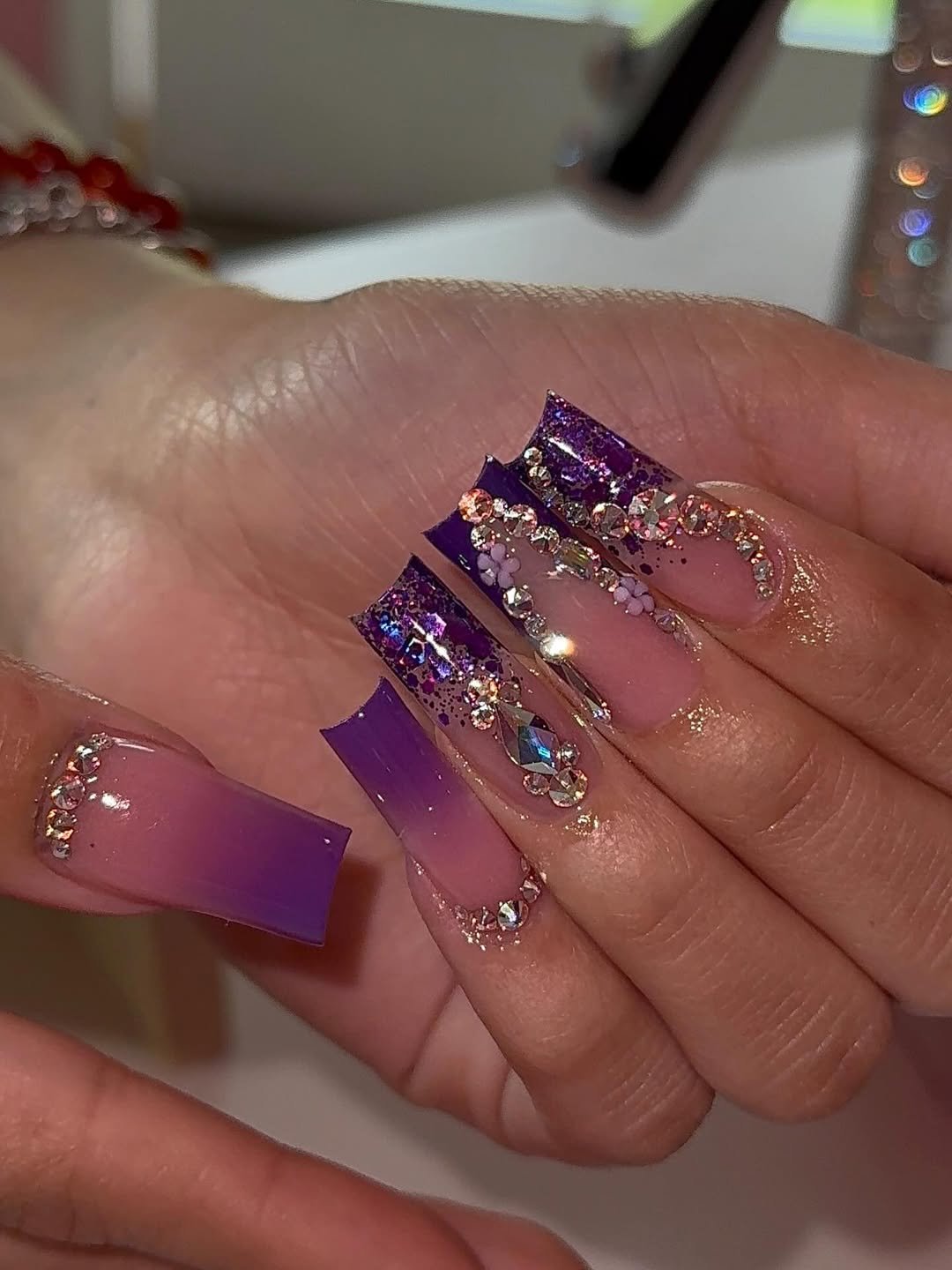 These nails feel like a late-night glam moment. The purple tones, layered glitter, and crystal detailing create depth that catches light from every angle.