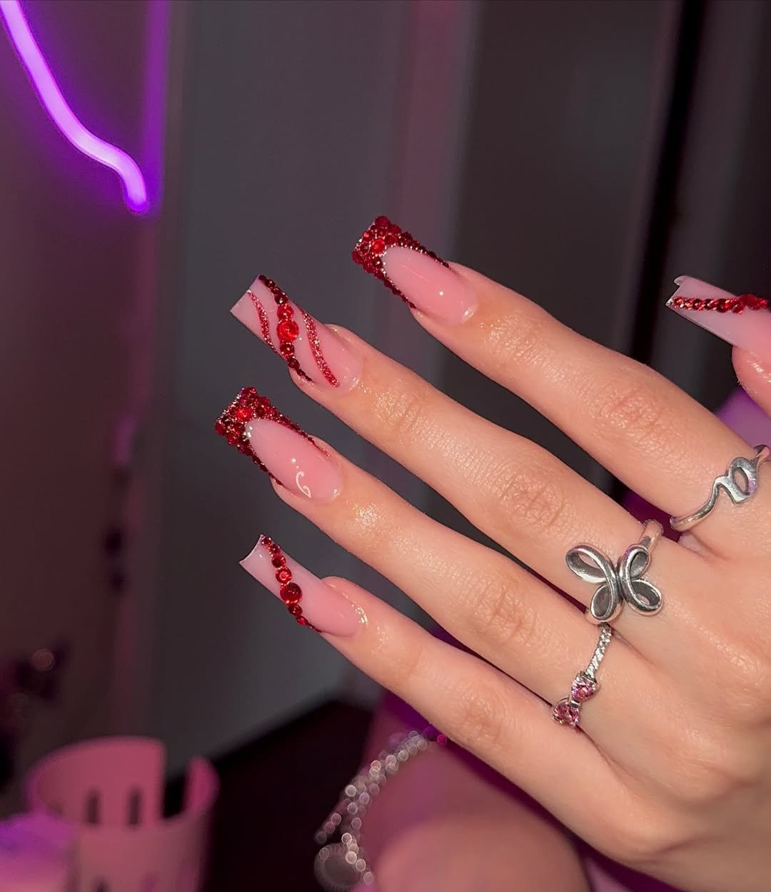 These red crystal tips are pure drama—in the best way. The contrast between the soft nude base and the bold red accents is striking and powerful.