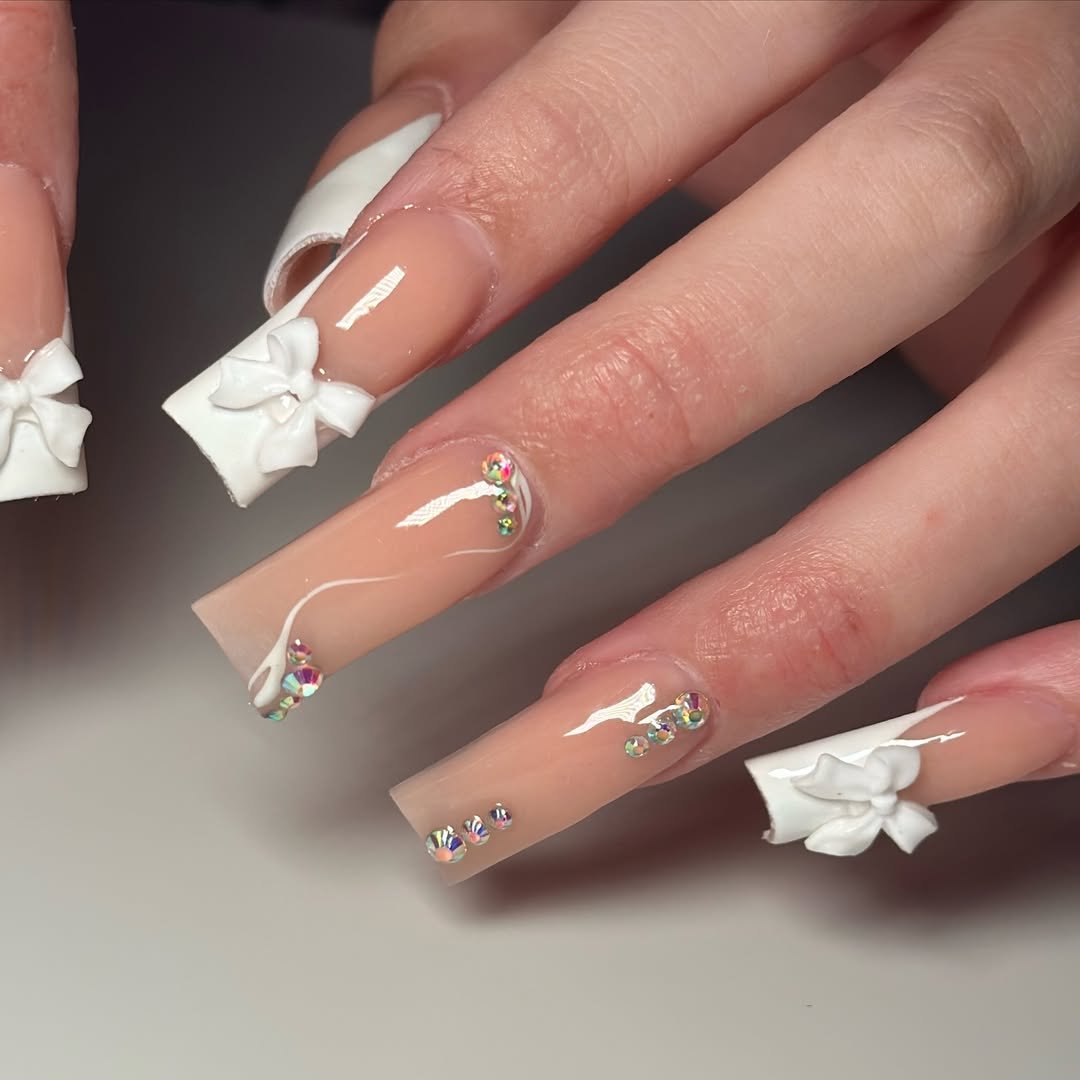These feel like prom night distilled into a manicure. Milky nude bases keep things polished, while sculpted white bows and crystal accents bring in that fairy-tale finish. It’s delicate, but not shy.