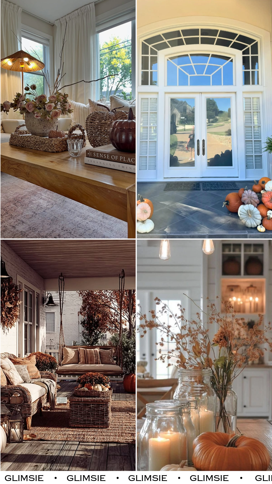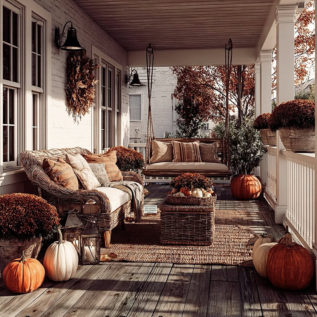 This porch feels like it was made for slow afternoons. Woven furniture, layered pillows, and scattered pumpkins create a space that invites you to sit, stay, and let the day stretch out.