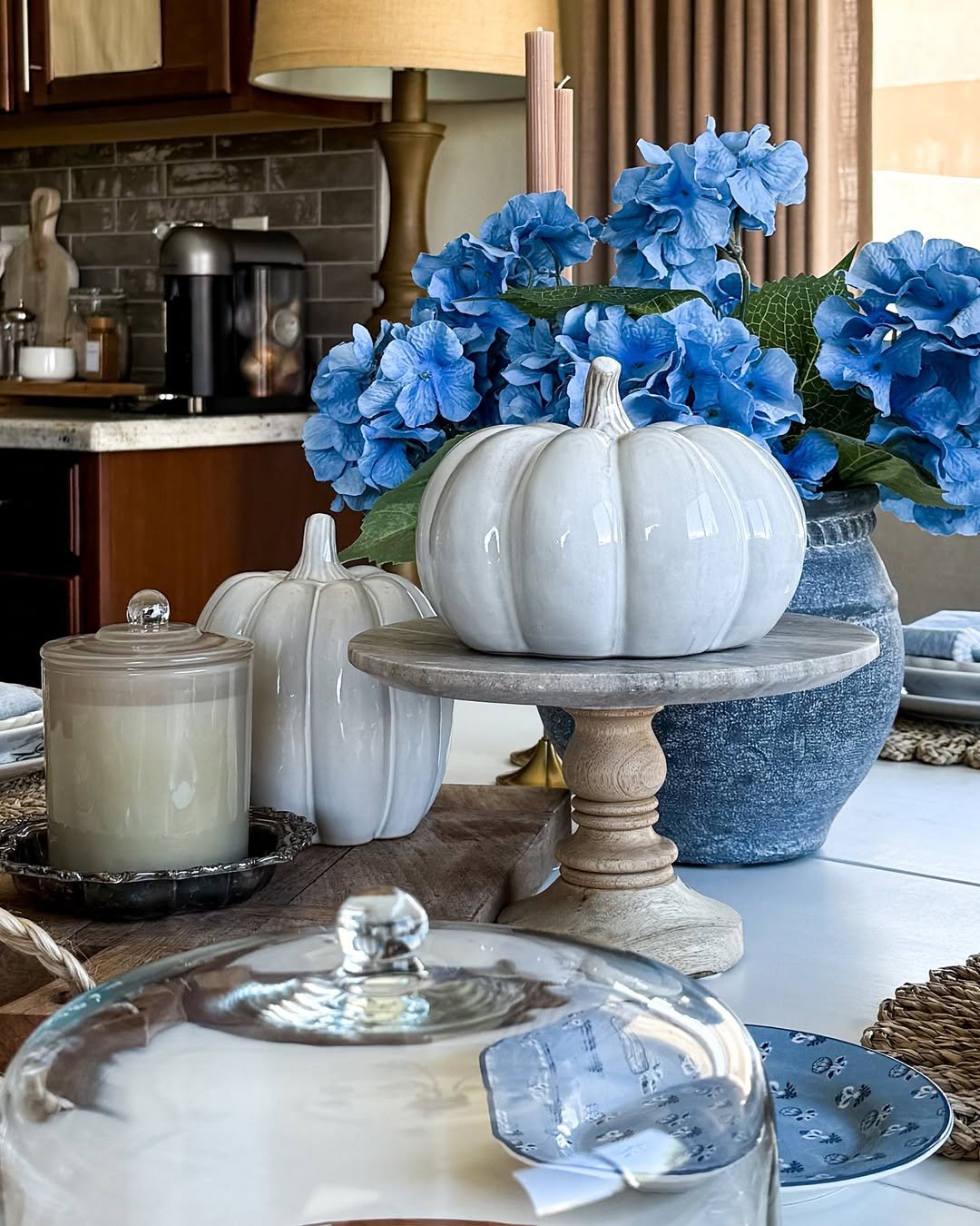 This palette shift catches your eye immediately. Cool blue hydrangeas against creamy white pumpkins create a contrast that feels crisp, clean, and slightly unexpected for fall.