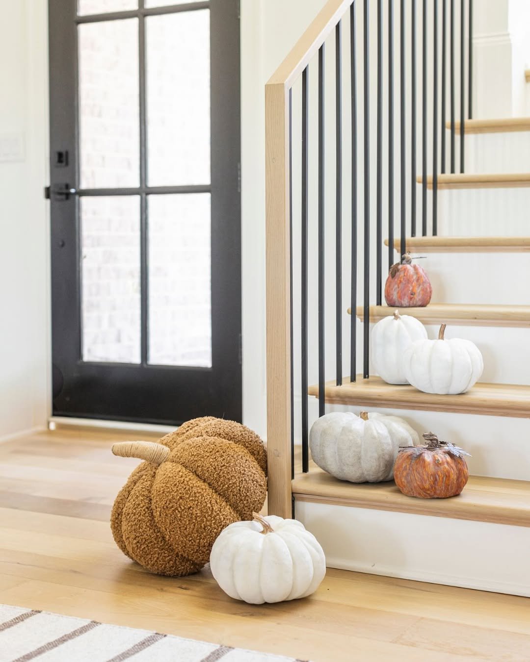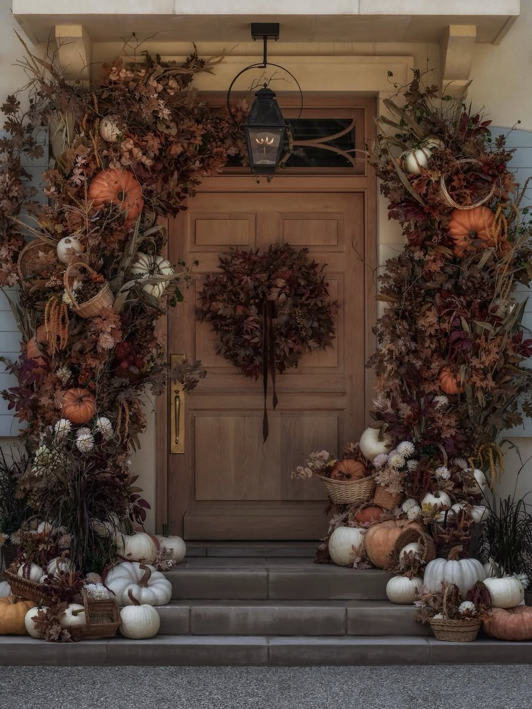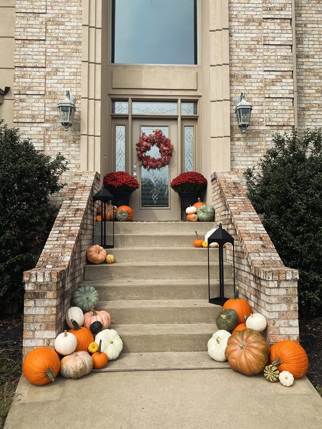 This entryway captures that familiar fall welcome. A mix of pumpkins in soft creams, greens, and warm orange tones scattered along the steps feels inviting without feeling overdone.