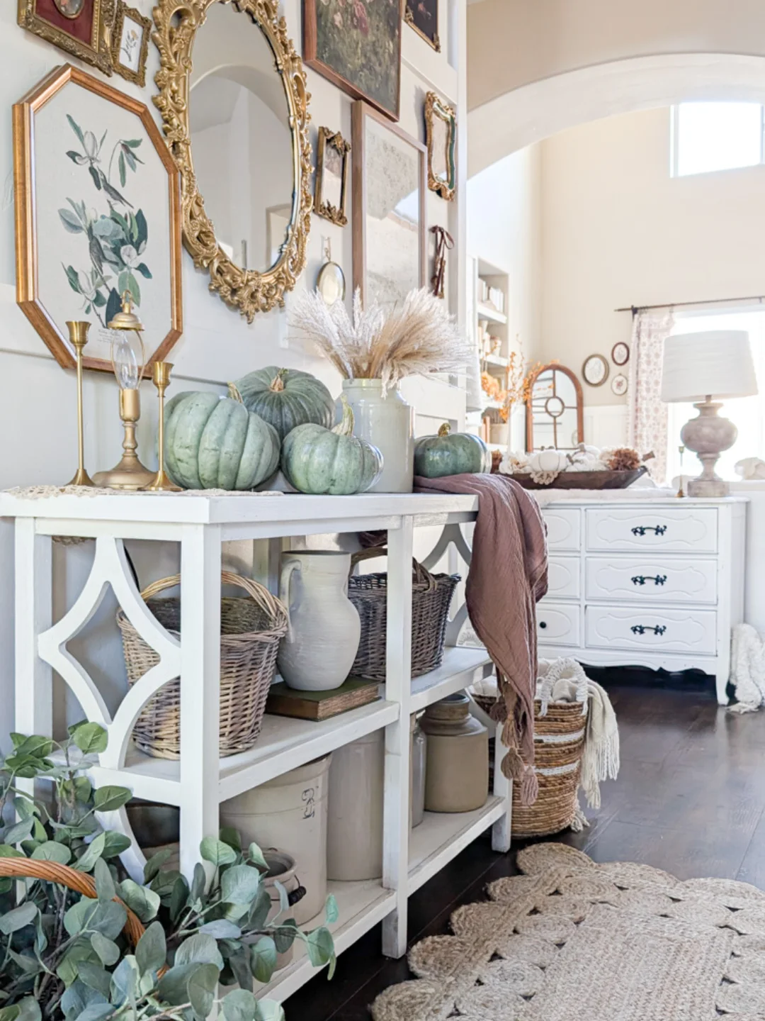 This entry feels layered in stories. Green pumpkins, woven baskets, and vintage-inspired frames come together in a way that feels curated over time rather than styled in a single afternoon.