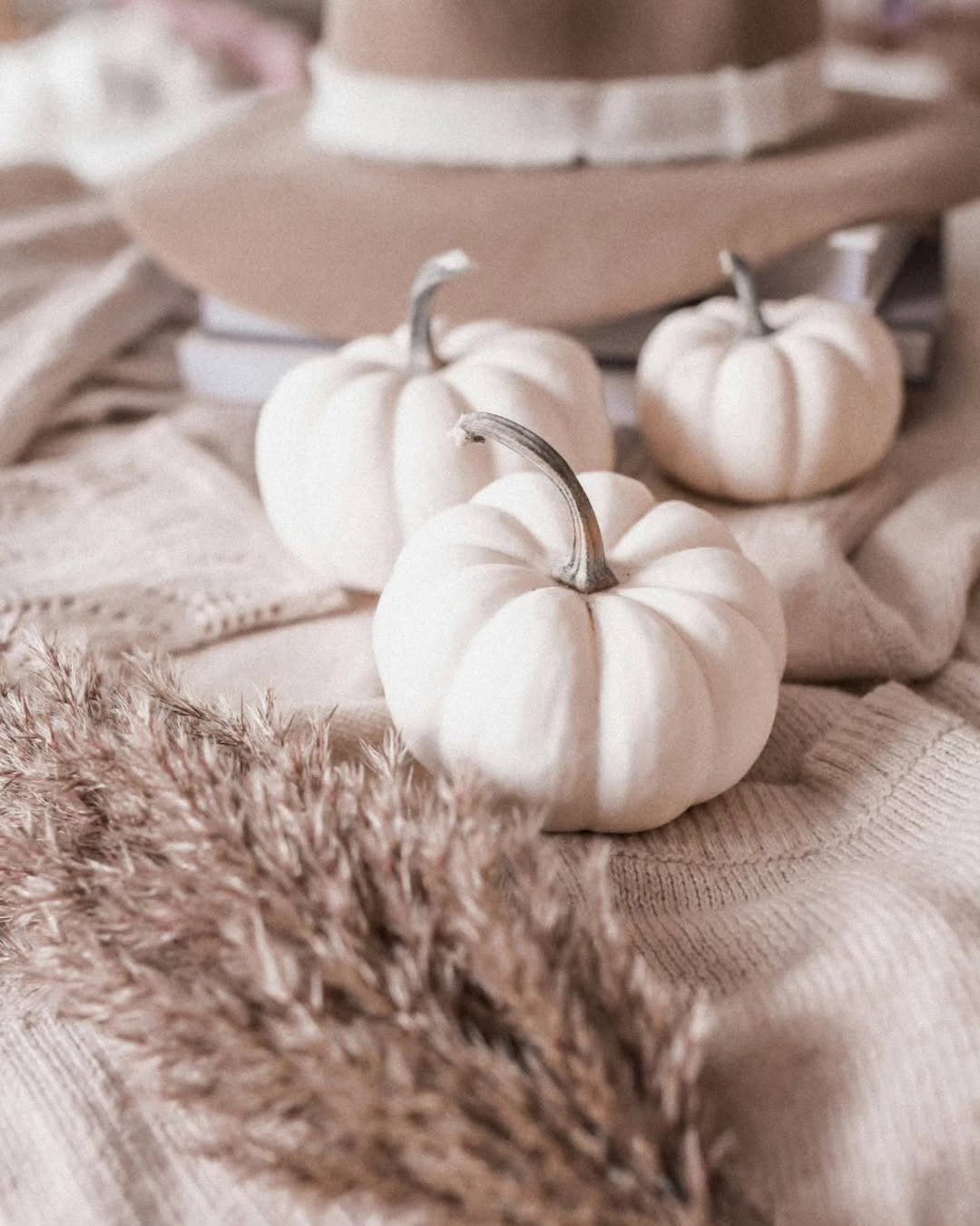This one leans fully into texture. Plush fabrics, muted tones, and those matte white pumpkins create a scene that feels soft to the touch before you even step closer.