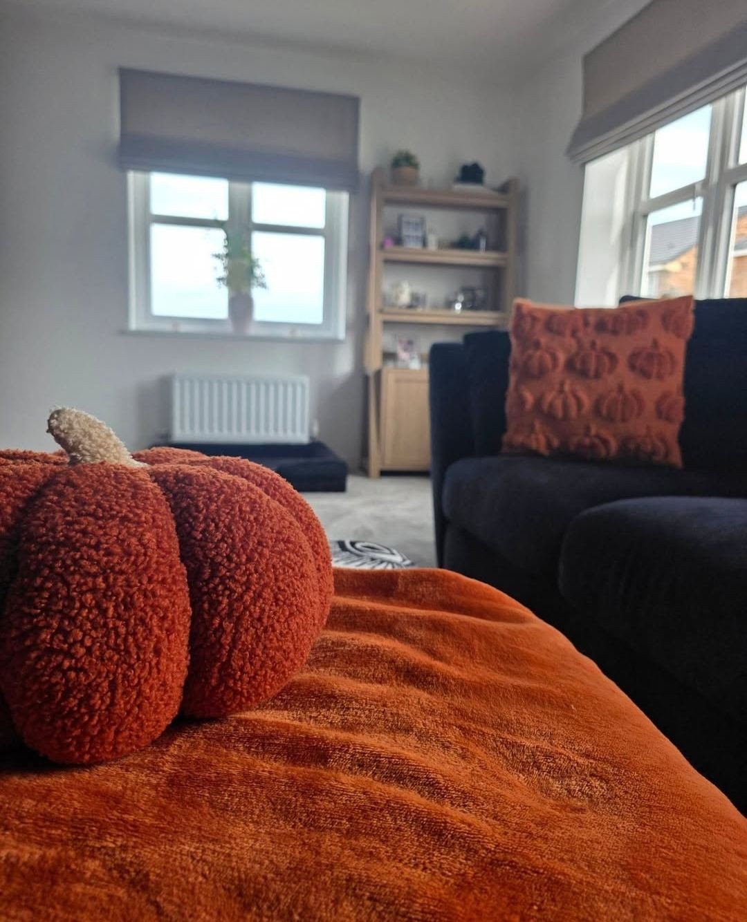 This corner leans fully into comfort. Plush textures, deep rust tones, and that oversized pumpkin cushion create a space that feels made for curling up with a blanket and staying there.