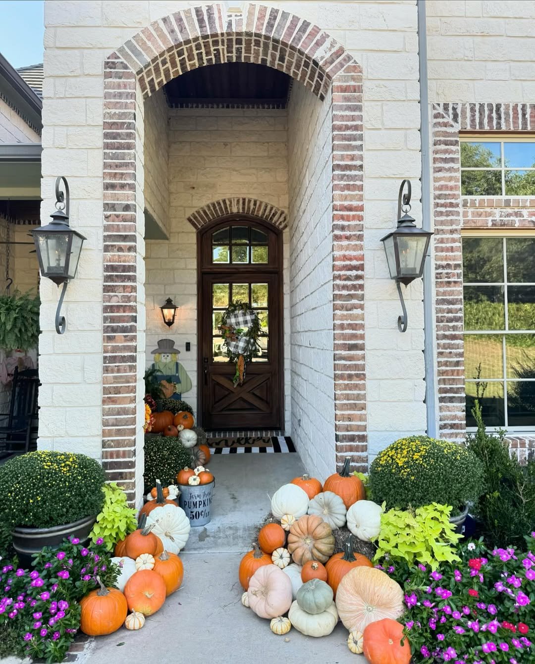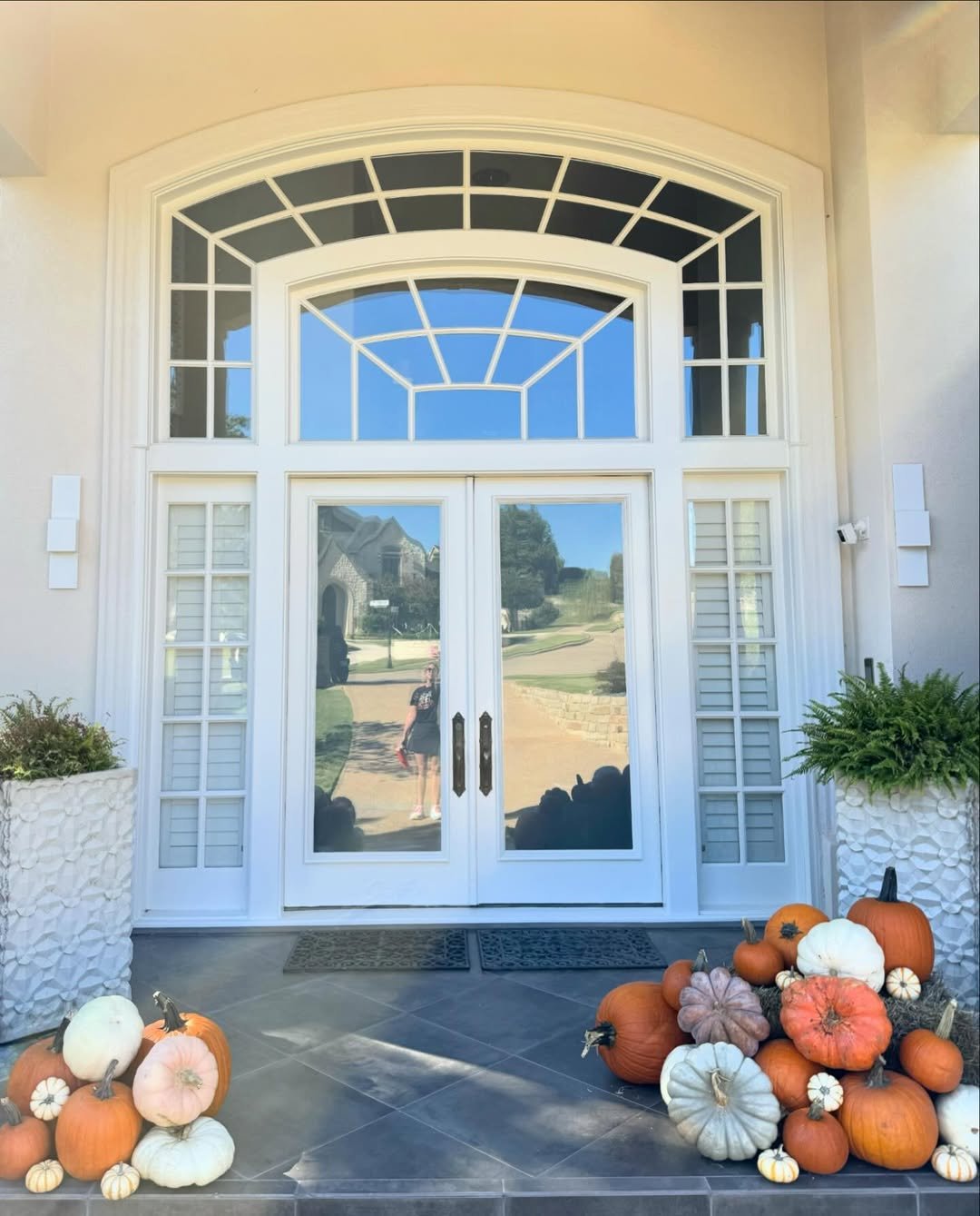 The scale here makes an impression. Tall doors, clean architecture, and clusters of pumpkins in varied shades create a look that feels polished yet seasonal.