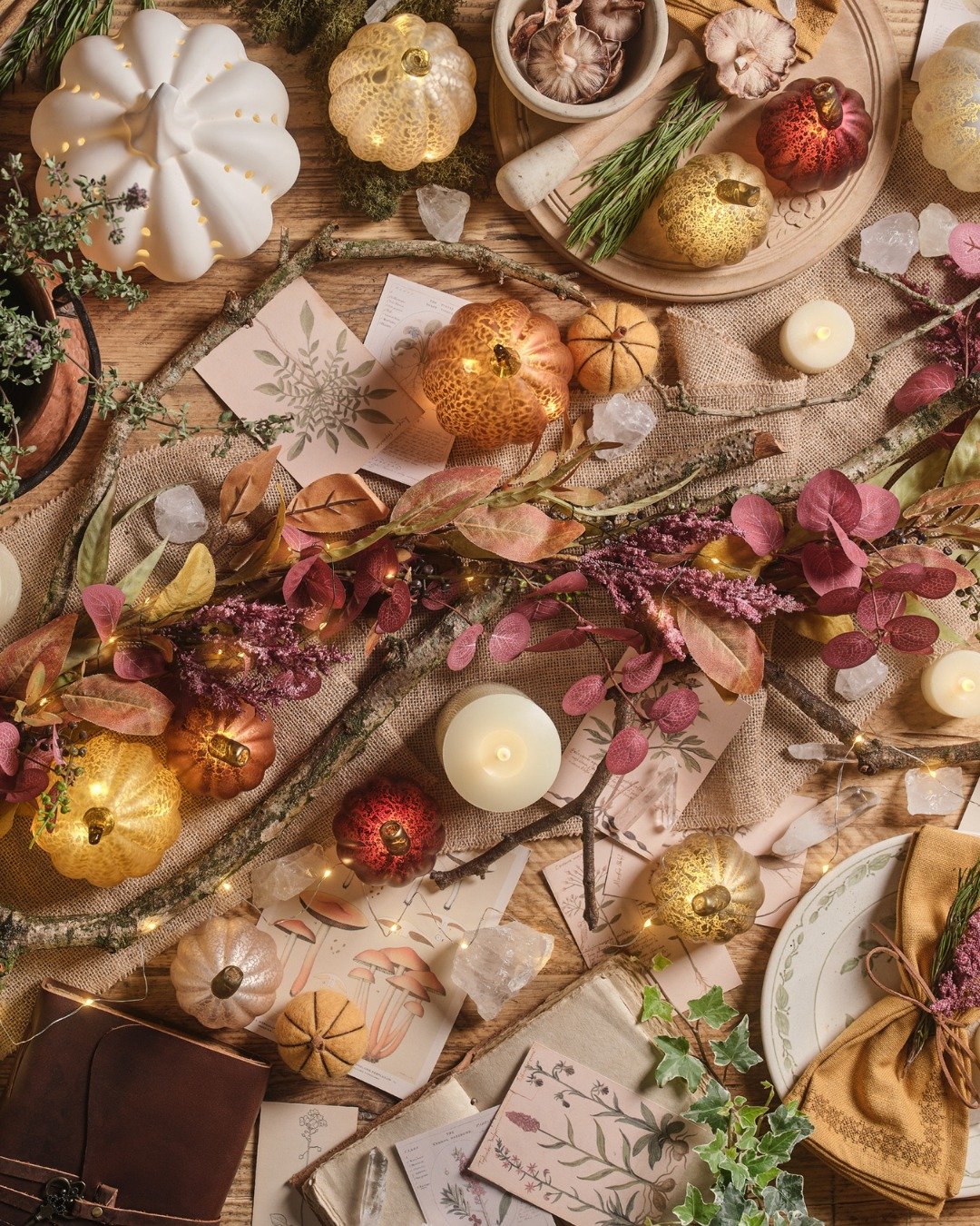 There’s a quiet magic woven into this scene. Glowing pumpkins, scattered crystals, and delicate botanical prints create a layered story that feels almost enchanted, like a slow autumn evening captured mid-moment.