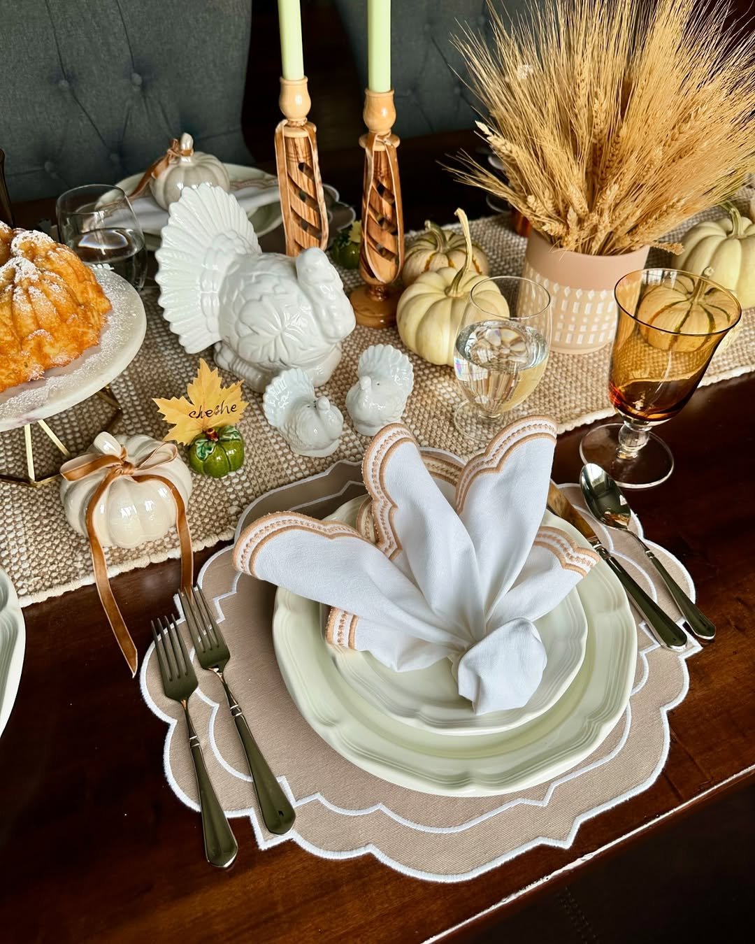 This table setting leans into tradition, but with a softer hand. Creamy pumpkins, woven textures, and ceramic turkeys create a layered centerpiece that feels rich without feeling busy.