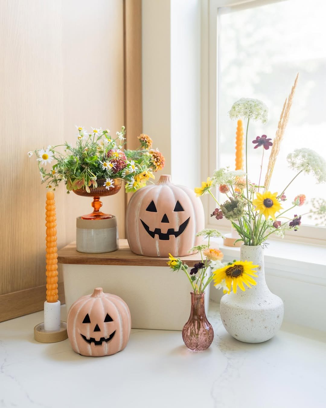 Soft pastels meet classic autumn here, and somehow it just works. The blush-toned pumpkins paired with delicate florals feel light, almost springlike, but grounded by warm candlelight and natural textures.