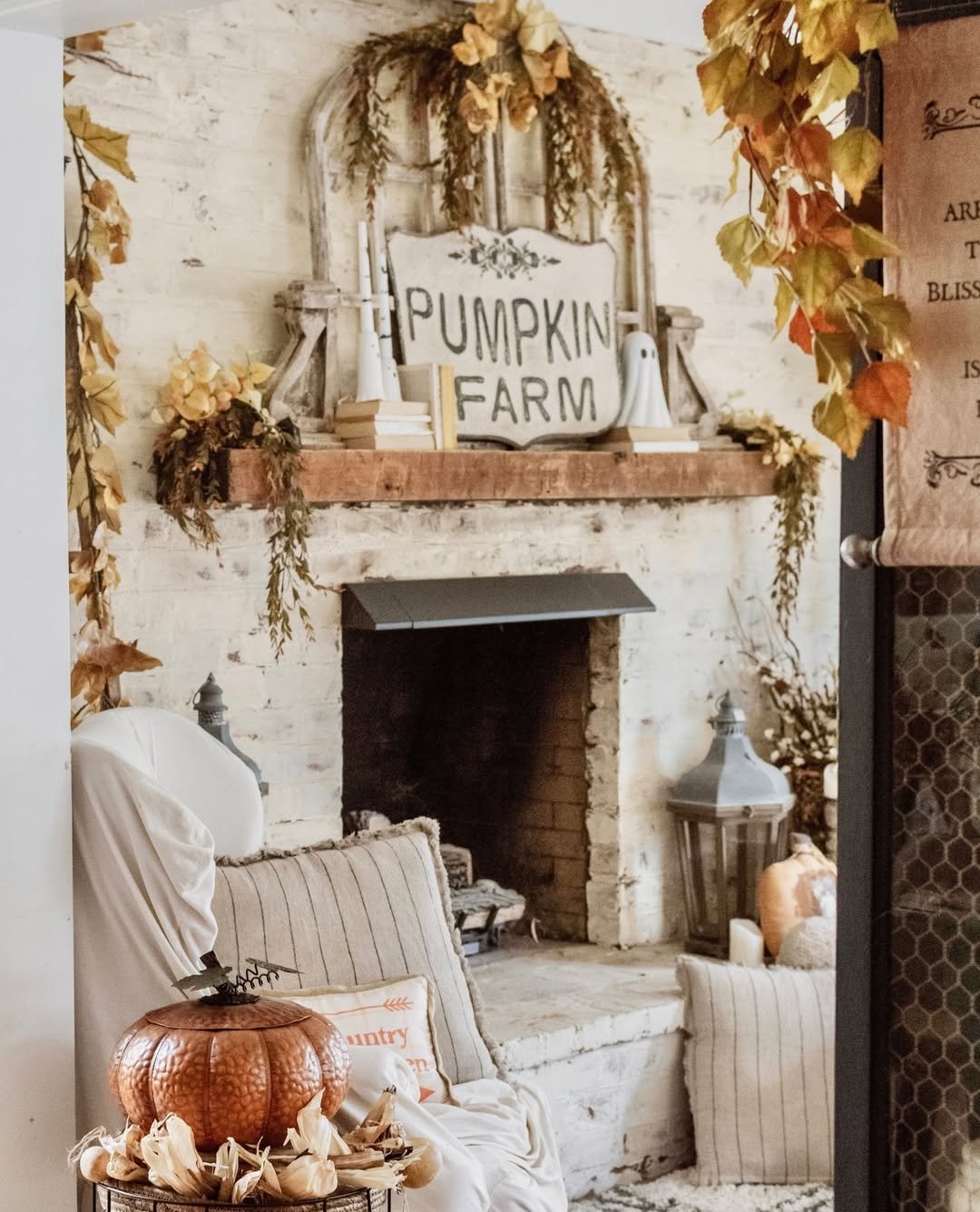 This mantel tells a full story without saying too much. Faded greenery, layered garlands, and that classic “Pumpkin Farm” sign create a look that feels collected and lived-in.