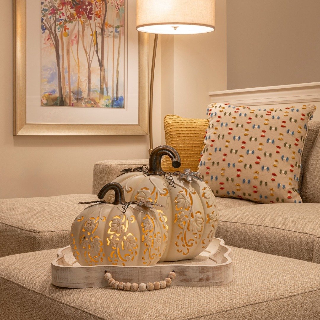 There’s something about candlelit pumpkins that instantly changes the mood. The carved details glow gently, casting soft light across neutral upholstery and warm-toned textiles.