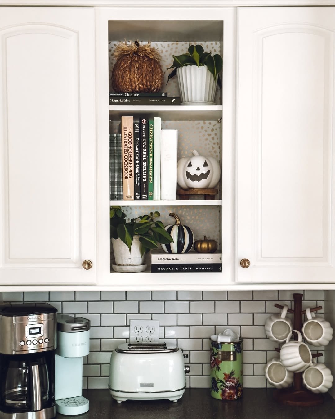 This one feels like a gentle shift between seasons. Blush florals and soft neutrals meet clean white cabinetry, creating a space that doesn’t fully commit to fall, but hints at it beautifully.