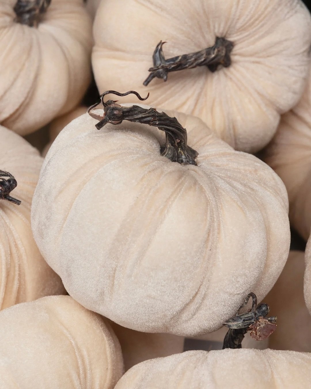 These pumpkins feel almost like heirlooms. Soft velvet surfaces paired with sculptural stems turn something simple into a tactile moment that begs to be noticed.