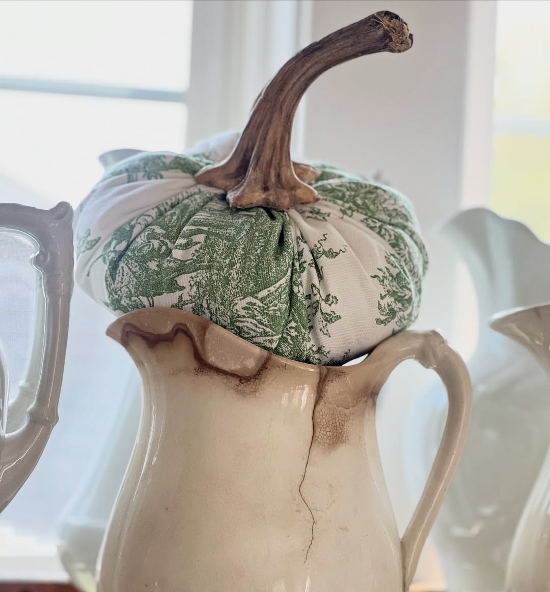 A simple pitcher becomes something special with a fabric pumpkin perched on top. The soft green toile pattern adds just enough detail without overpowering the neutral palette.