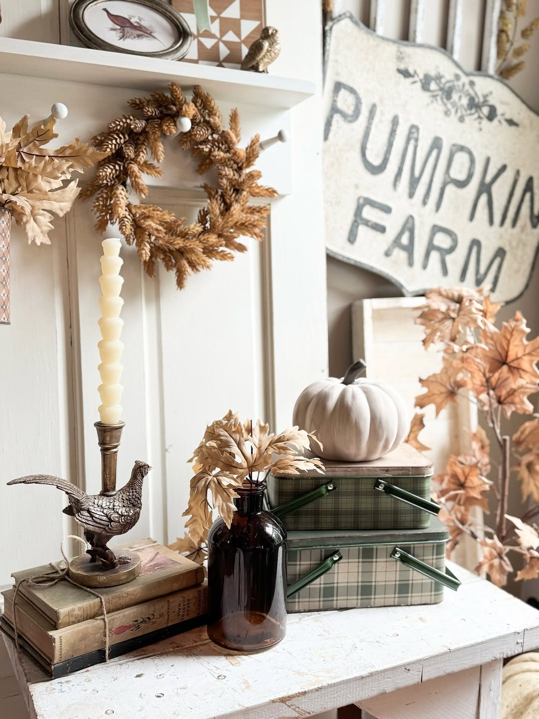 This corner feels like a page from an old countryside story. Muted leaves, worn books, and that soft white pumpkin tucked among amber glass create a palette that leans entirely into warmth without trying too hard.