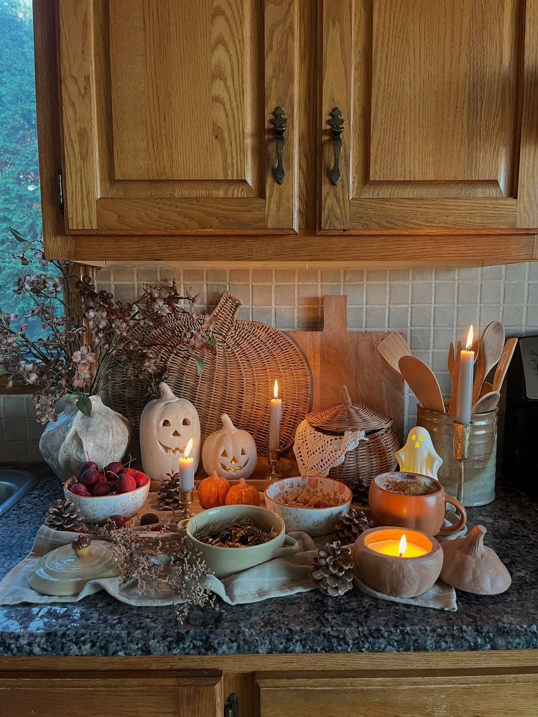 Soft candlelight flickers against wood and stone, turning this kitchen corner into something intimate. Neutral pumpkins and woven textures sit beside everyday pieces, blending decor with function.