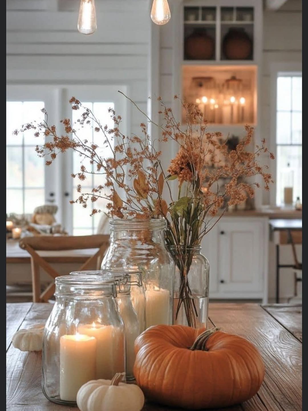 Candlelight and glass jars bring this kitchen moment to life. Paired with a single pumpkin and dried stems, it feels simple but deeply atmospheric.