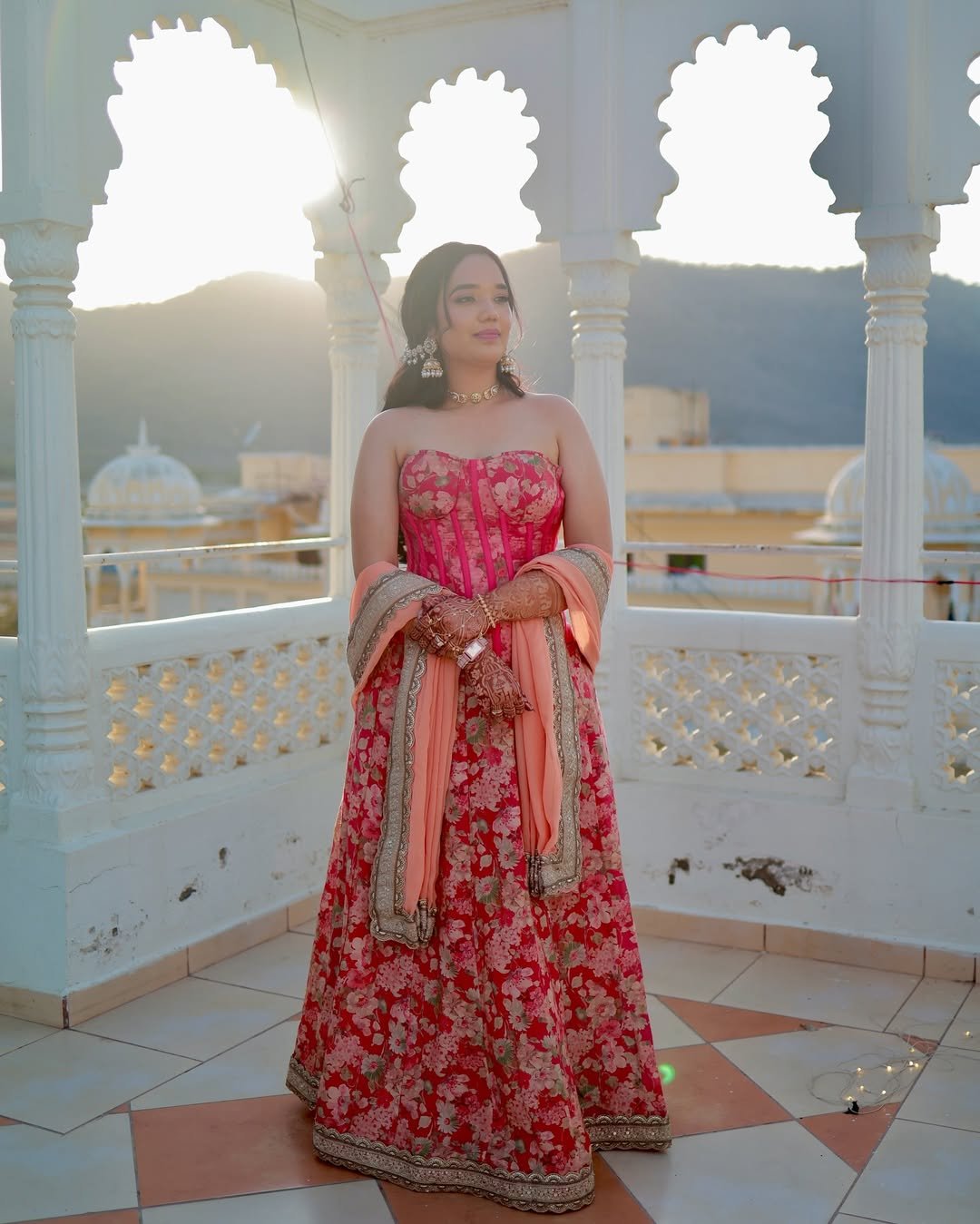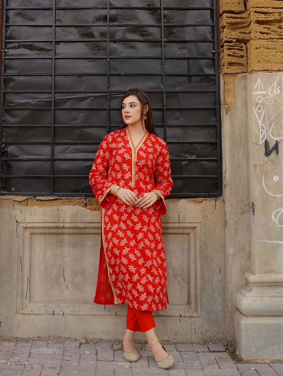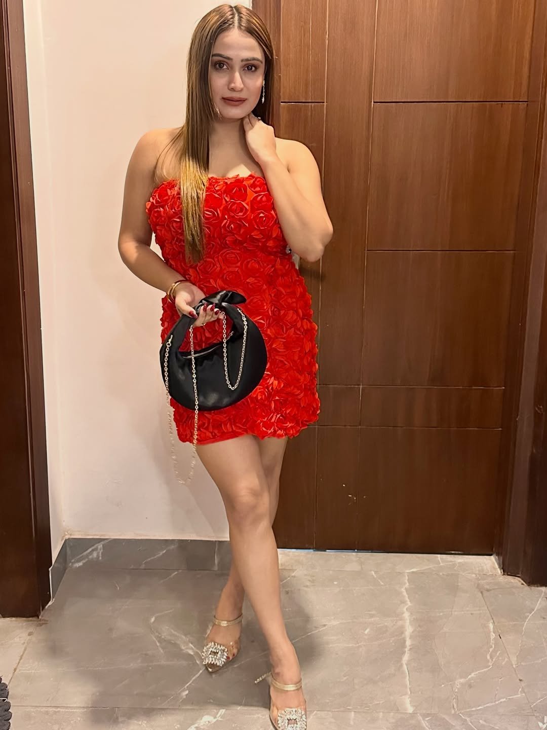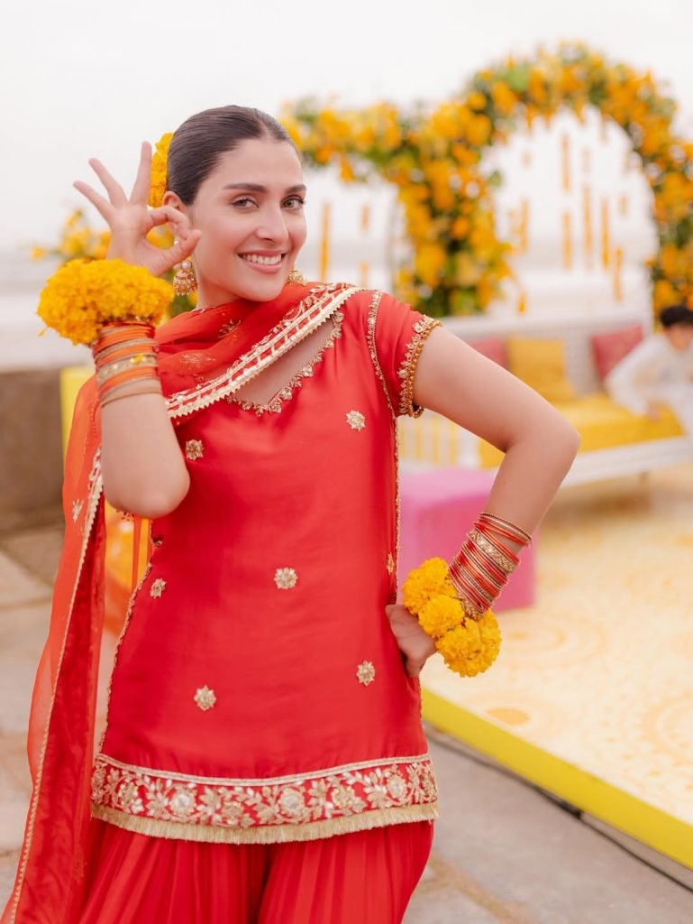 This look radiates happiness. Bright red tones, gold accents, and playful styling make it feel perfect for pre-wedding festivities. It’s the kind of outfit that moves with laughter and music.