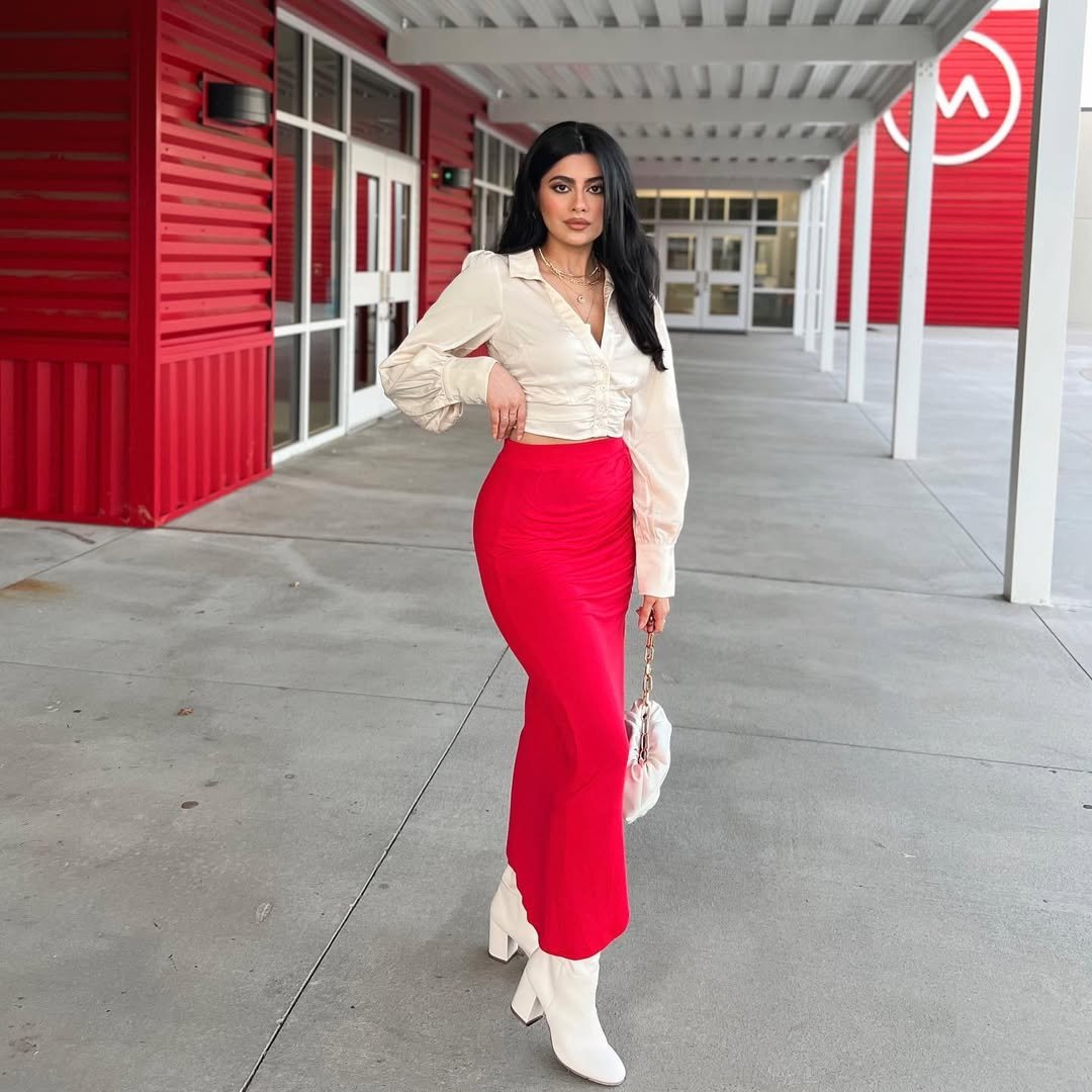 This look is all about balance. A crisp, creamy top paired with a bold red skirt feels modern, confident, and quietly powerful. It’s minimal, but not boring — the kind of outfit that turns heads without asking for attention.