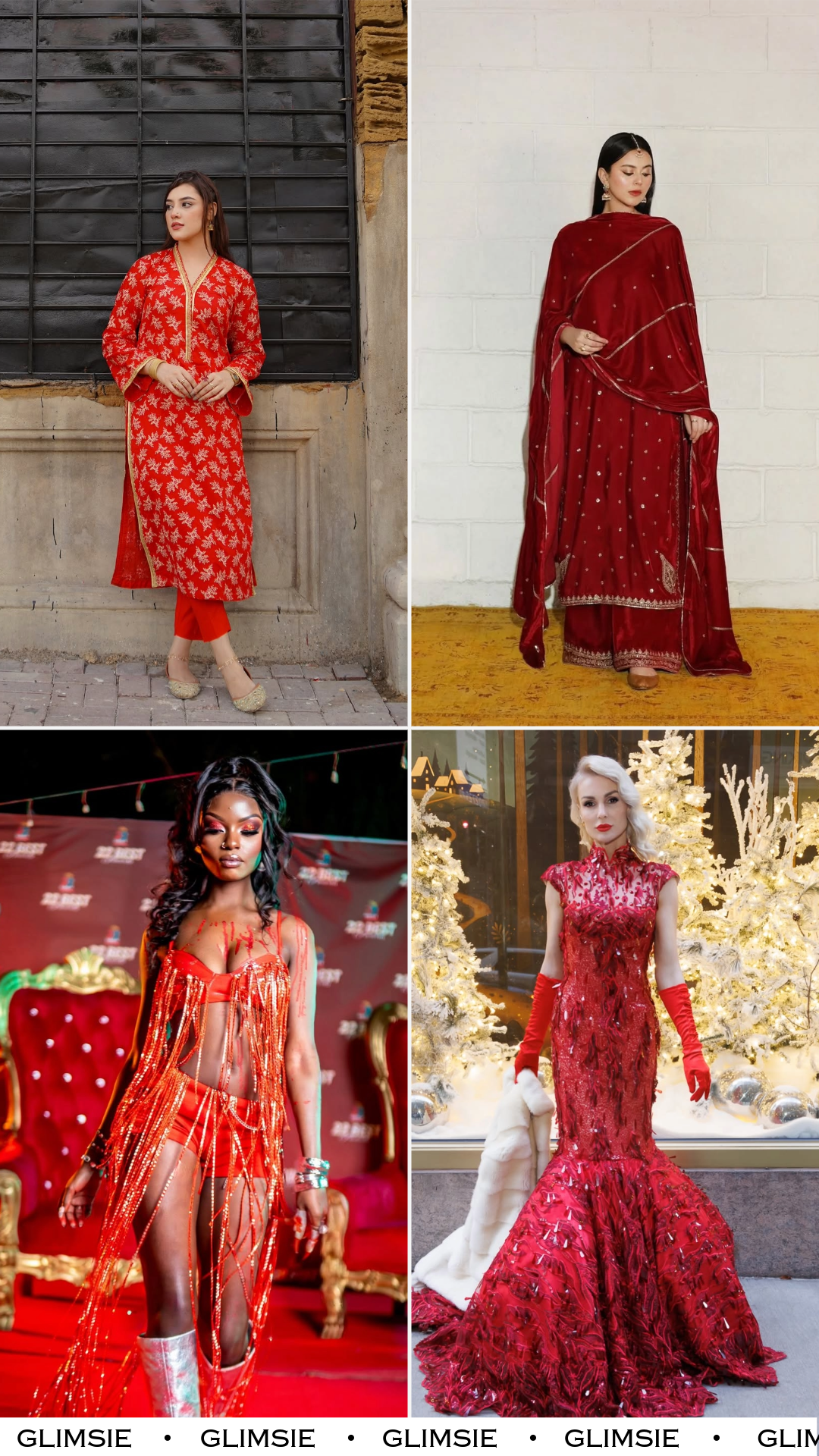 This is red with a capital R. Shimmering textures, bold cuts, and unapologetic glamour make this look feel like it belongs under bright lights and loud applause. The gold accents don’t whisper here — they perform.