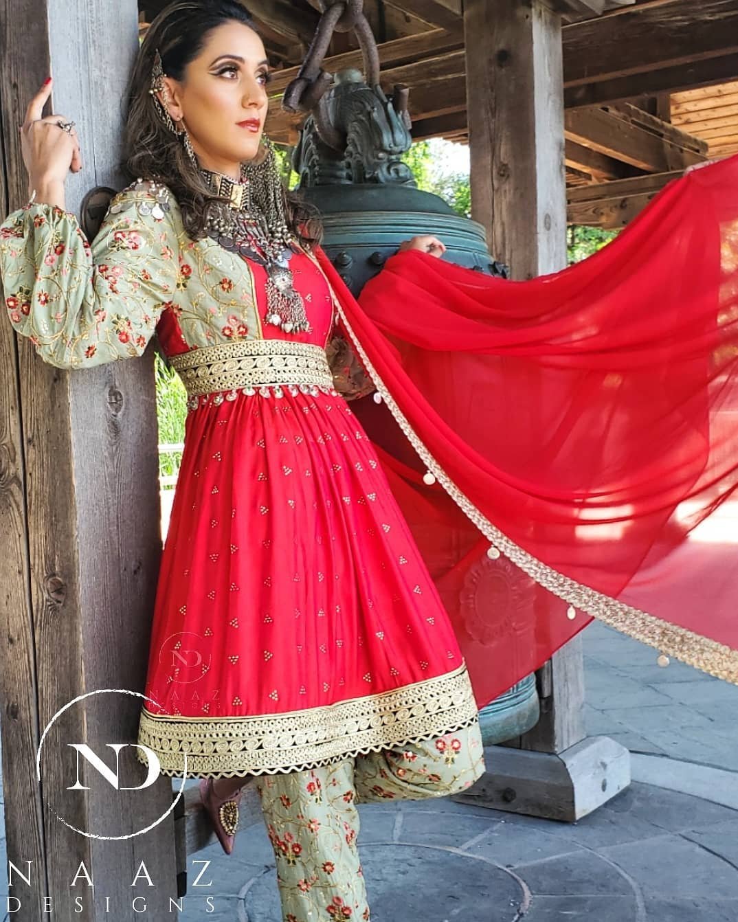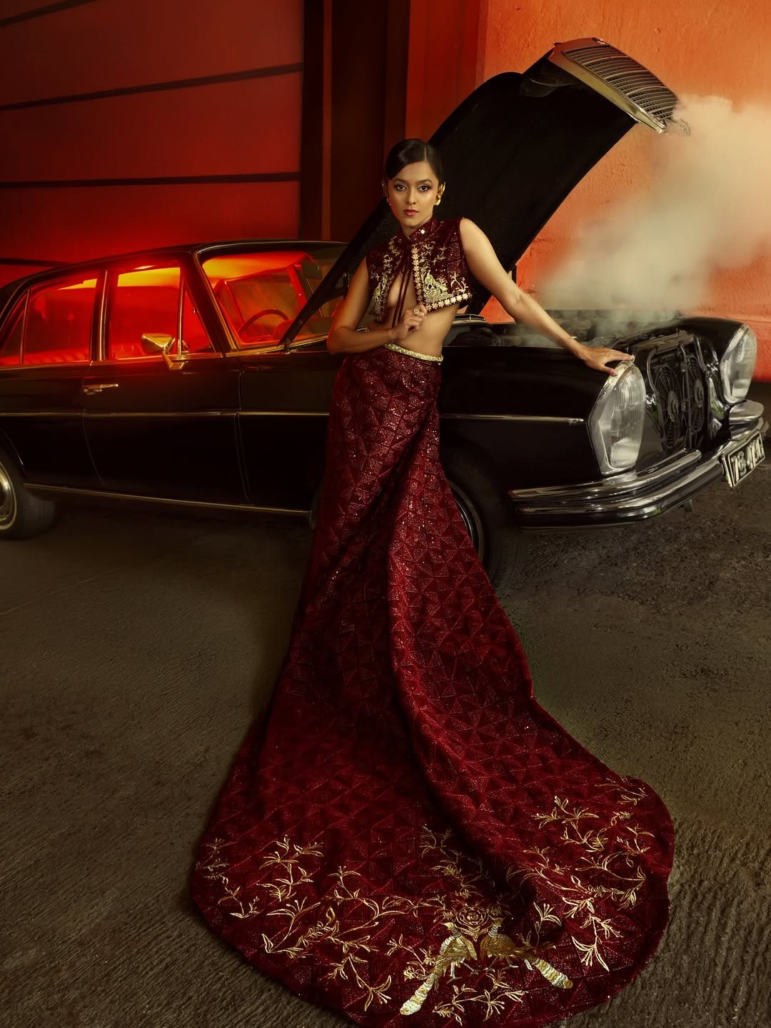 This look beautifully blends tradition with a global twist. The red-and-gold palette feels rich and ceremonial, while the styling adds an unexpected, artistic edge.