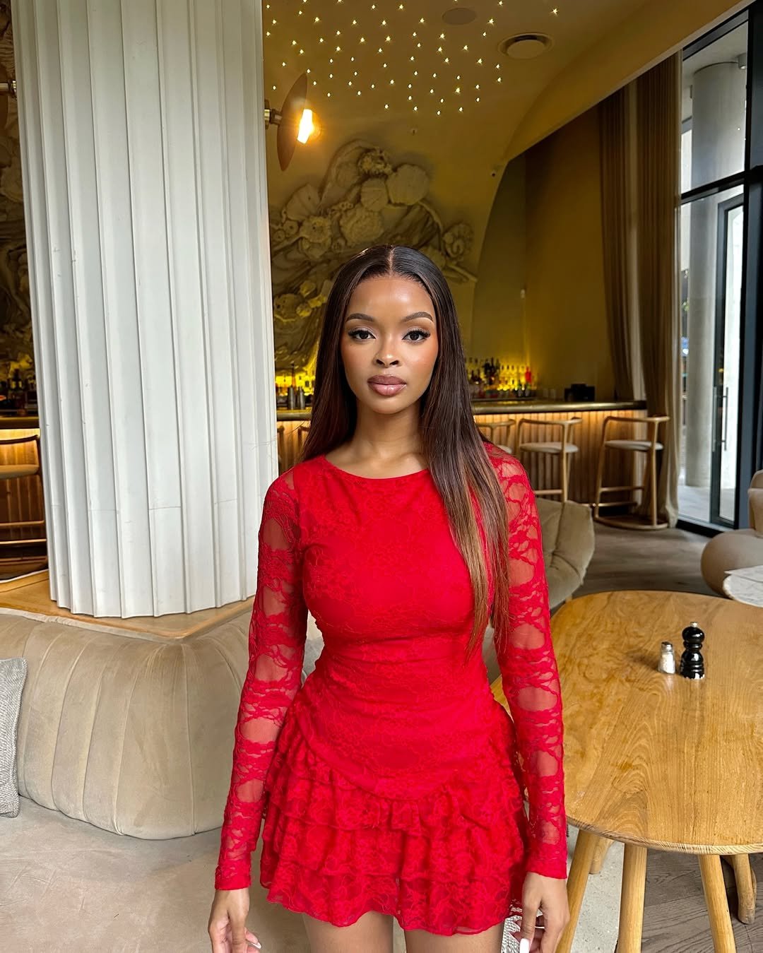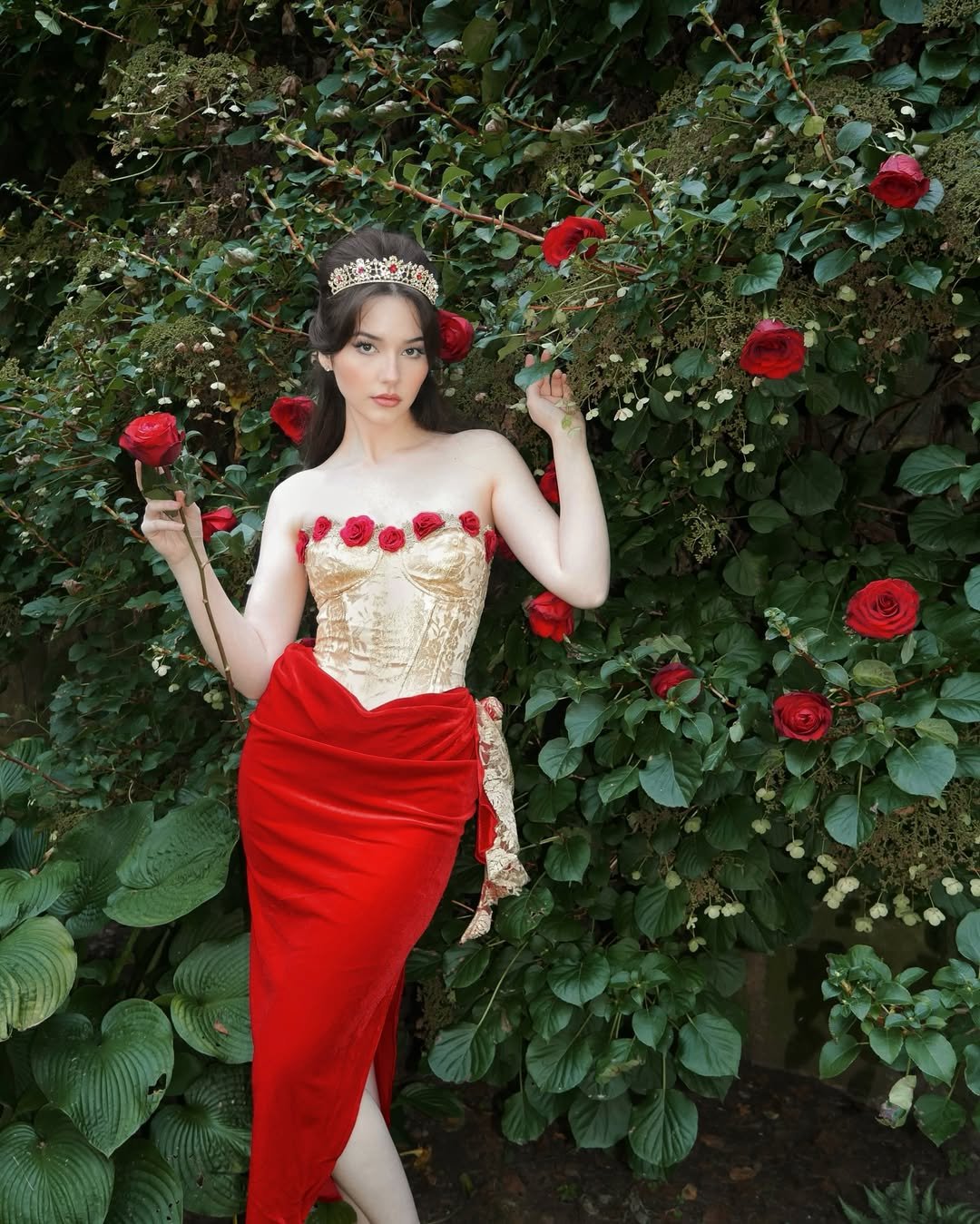 This look is pure fashion fantasy. The red and gold combination feels bold, sculptural, and editorial — like it belongs under spotlights. There’s drama in the cut, confidence in the shine, and zero hesitation in the styling.