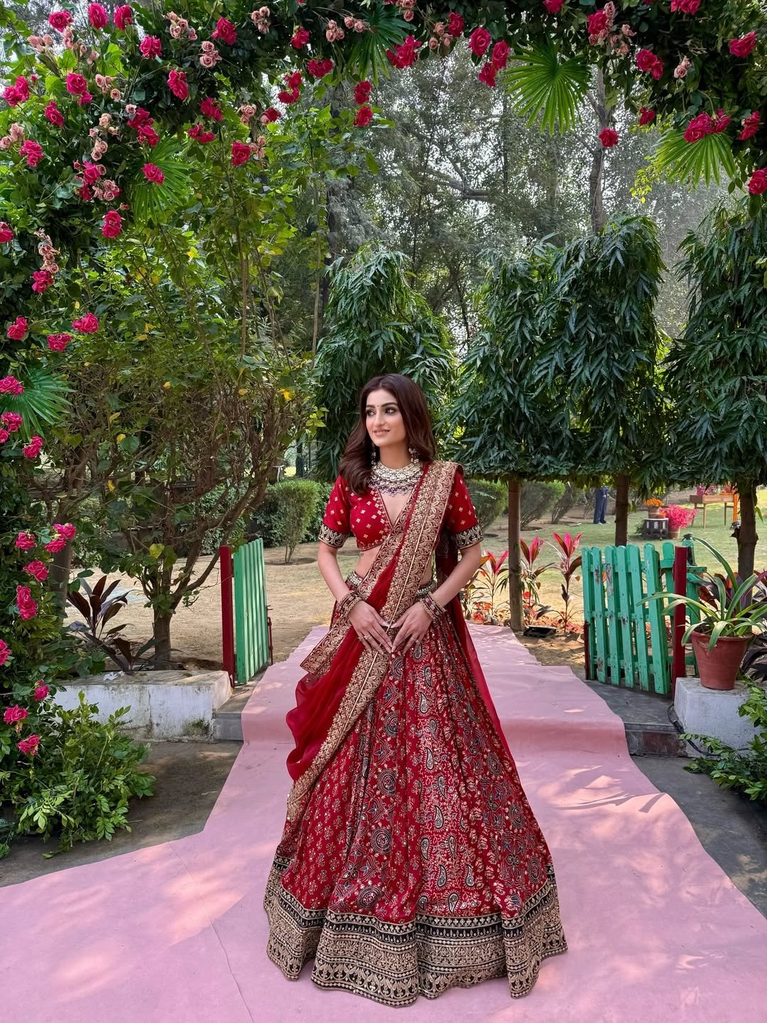 This is bridal red with a romantic twist. The intricate gold work paired with lush surroundings makes the entire look feel alive and celebratory. It’s detailed, but still airy.