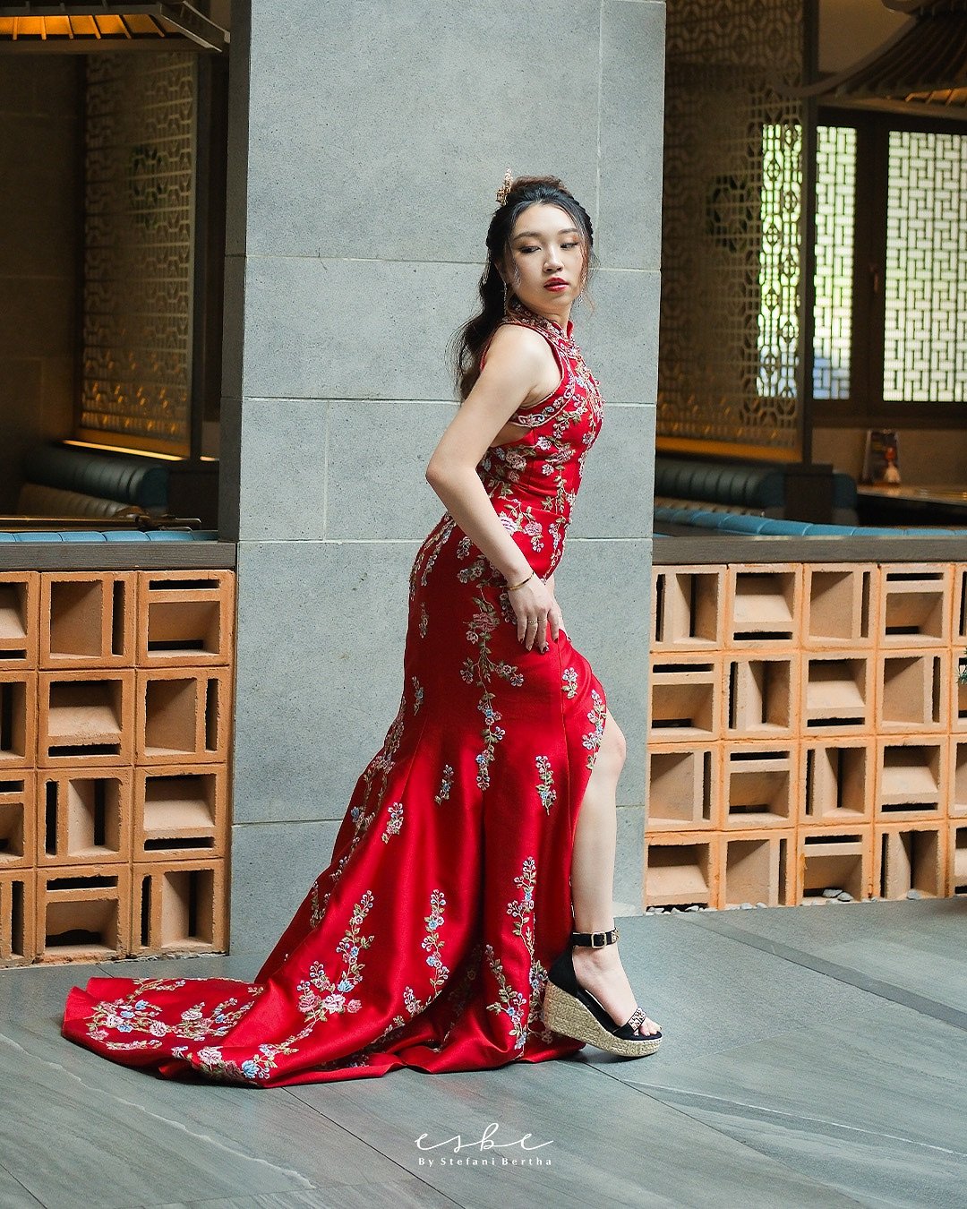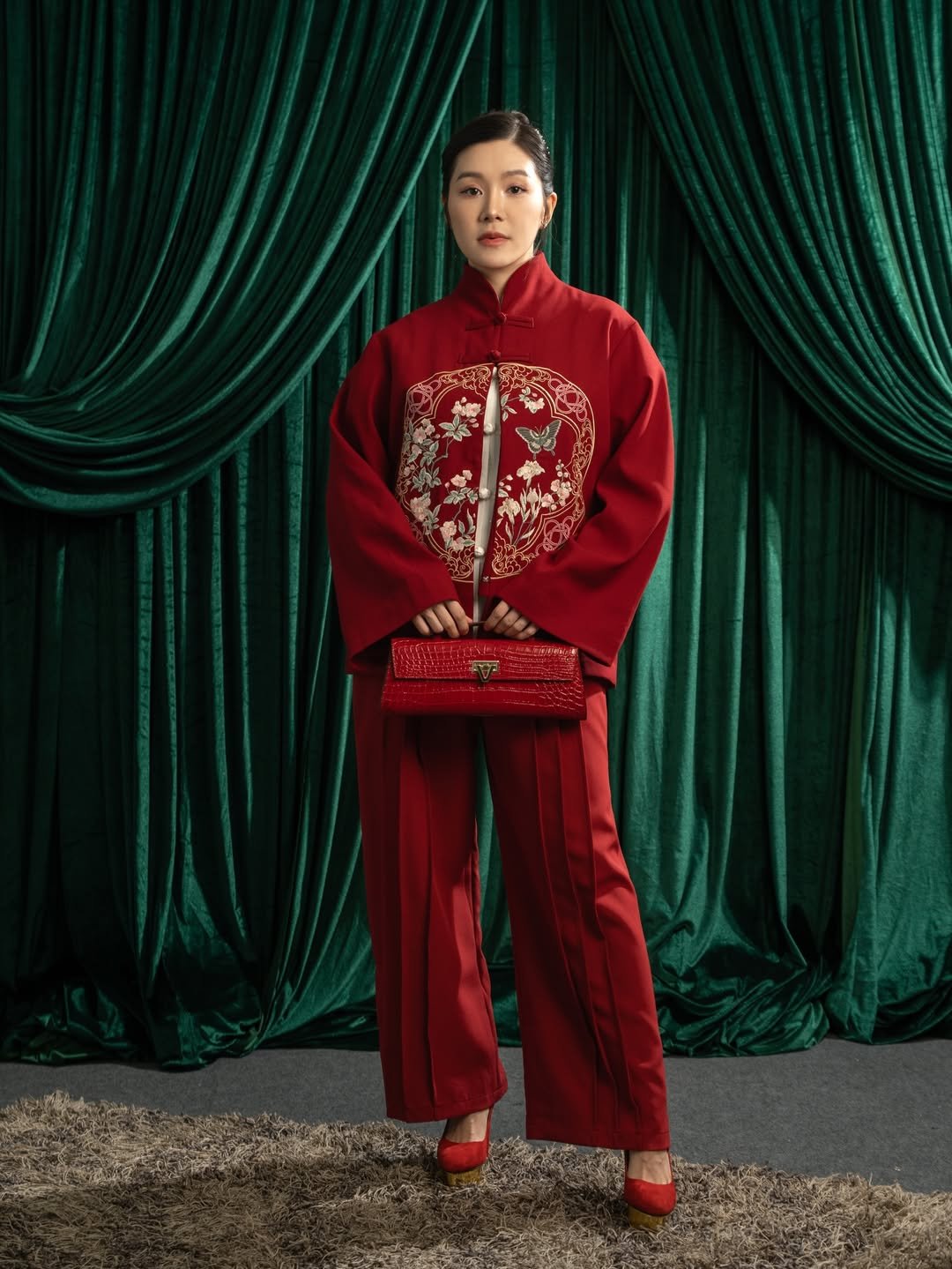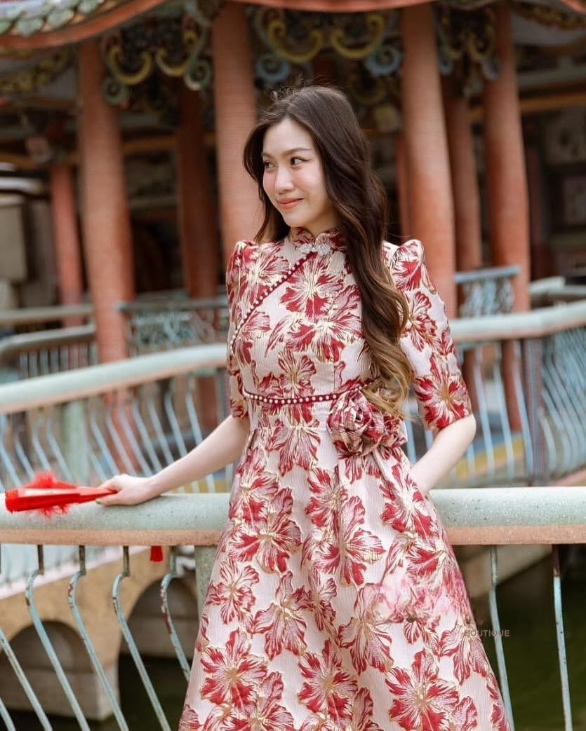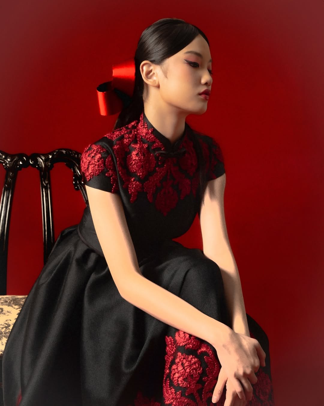 This look is pure Lunar New Year drama—in the best way. The rich red base paired with intricate black floral detailing feels powerful, elegant, and very “main character enters the room.” It hugs just right, structured but fluid, like tradition meeting confidence halfway.