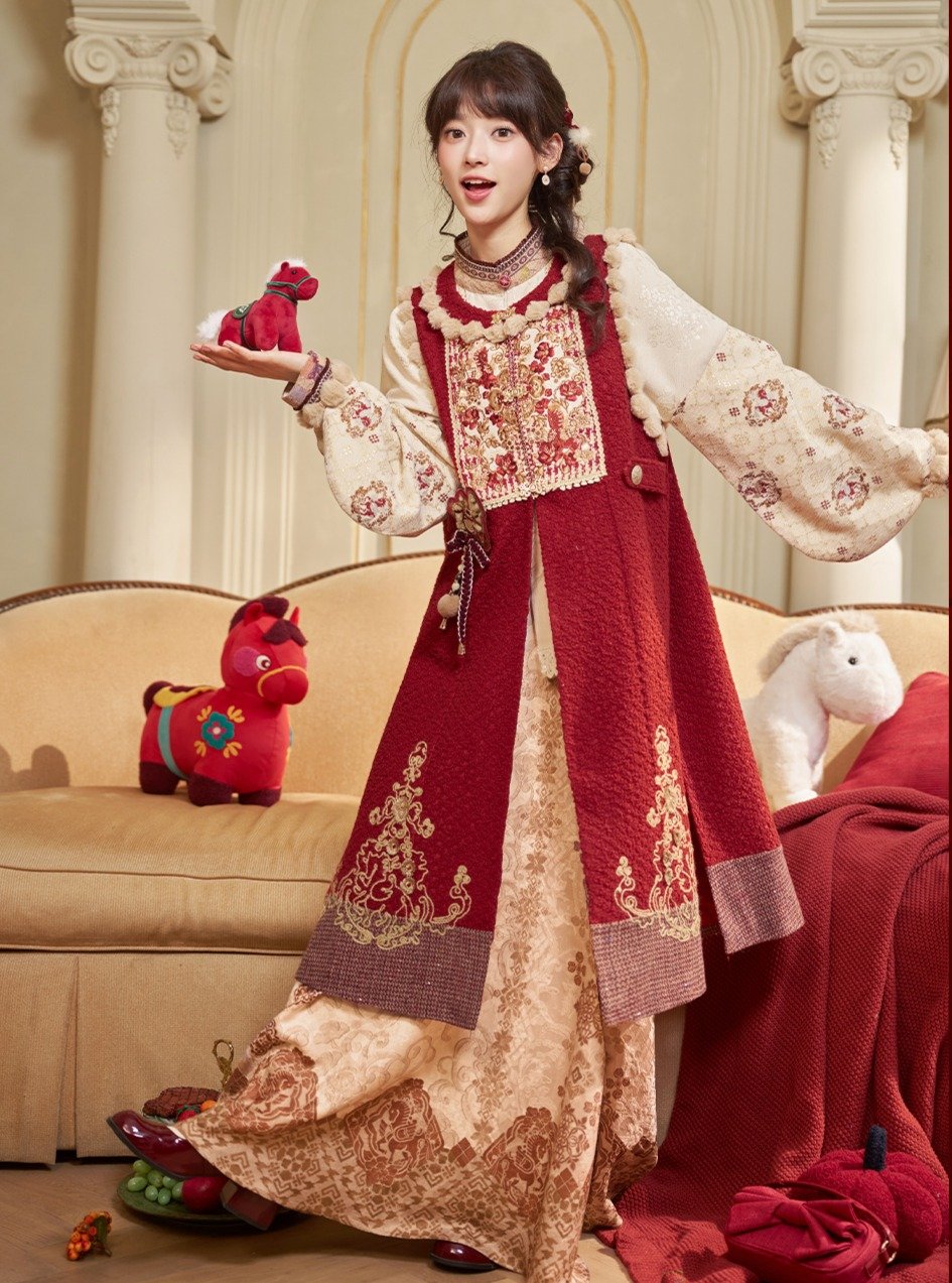 This outfit feels like it stepped out of a fairytale. Layered textures, embroidered panels, and warm red tones create a look that’s nostalgic and whimsical.