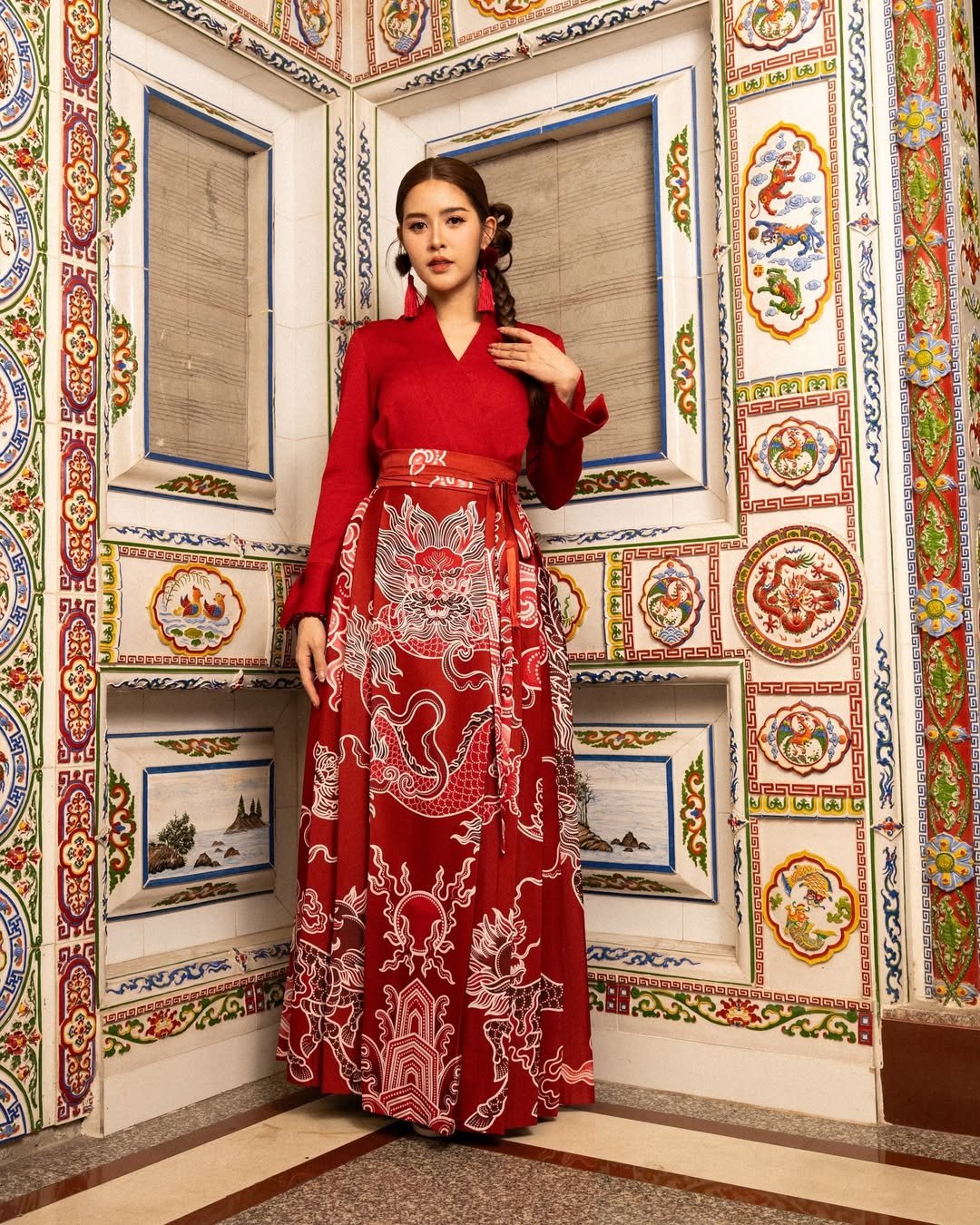There’s an artsy, almost handcrafted feel here that stands out instantly. The red tones feel earthy and warm, paired with design details that feel deeply rooted in tradition.