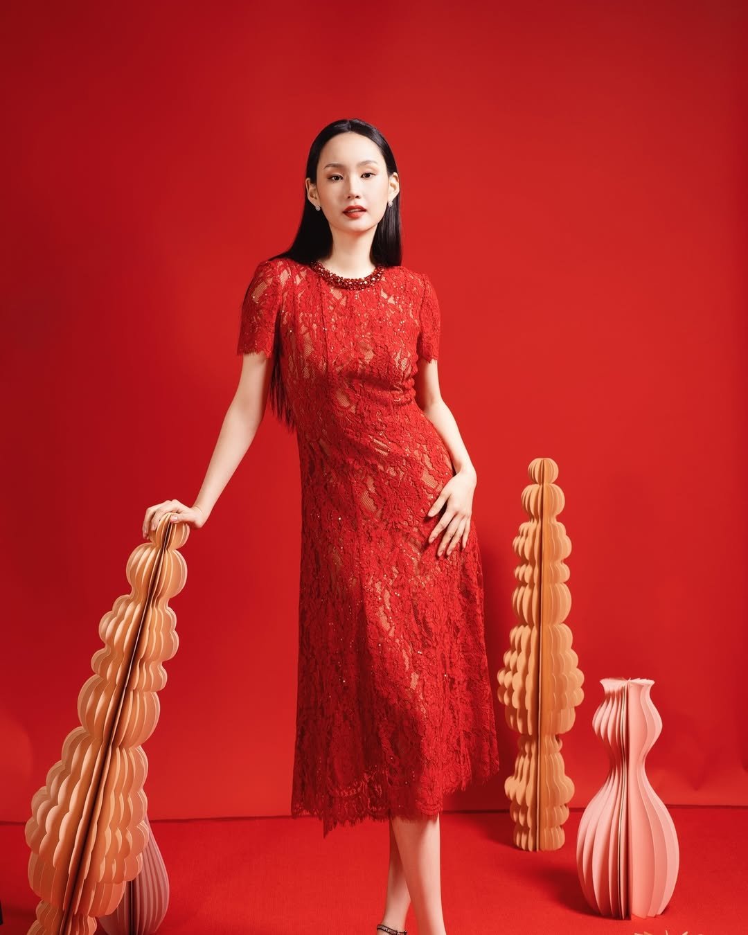 This is red-carpet energy, Lunar New Year edition. The sculptural bodice, dramatic sleeves, and intricate texture make this feel like wearable art.