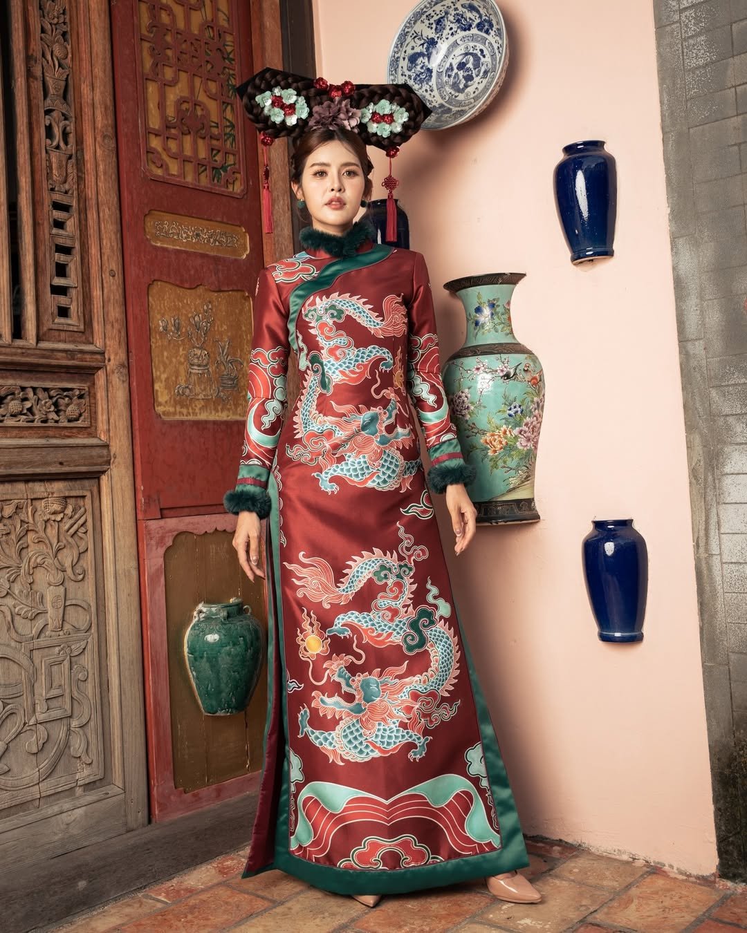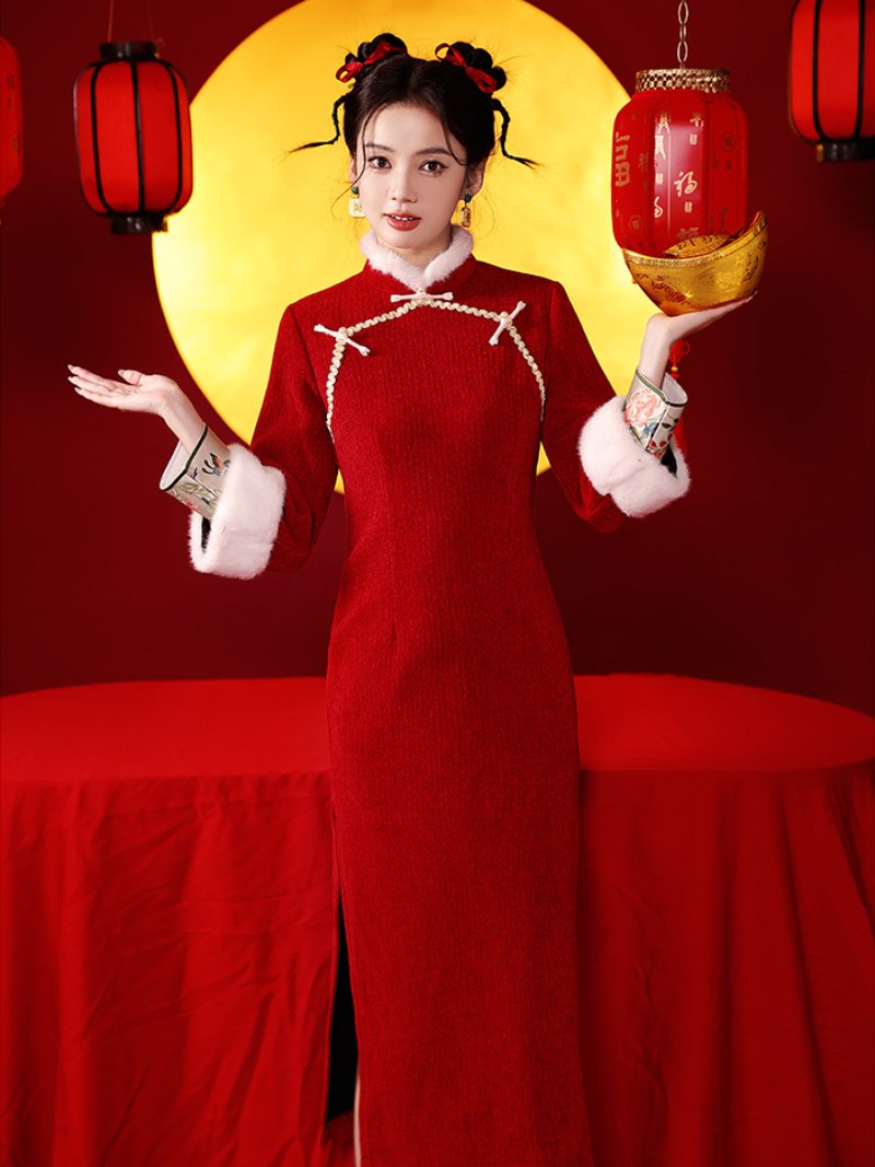 This one leans into the joy of the season. The red qipao-inspired silhouette feels youthful and celebratory, with soft trims that keep it light and approachable. It’s festive without being intimidating.