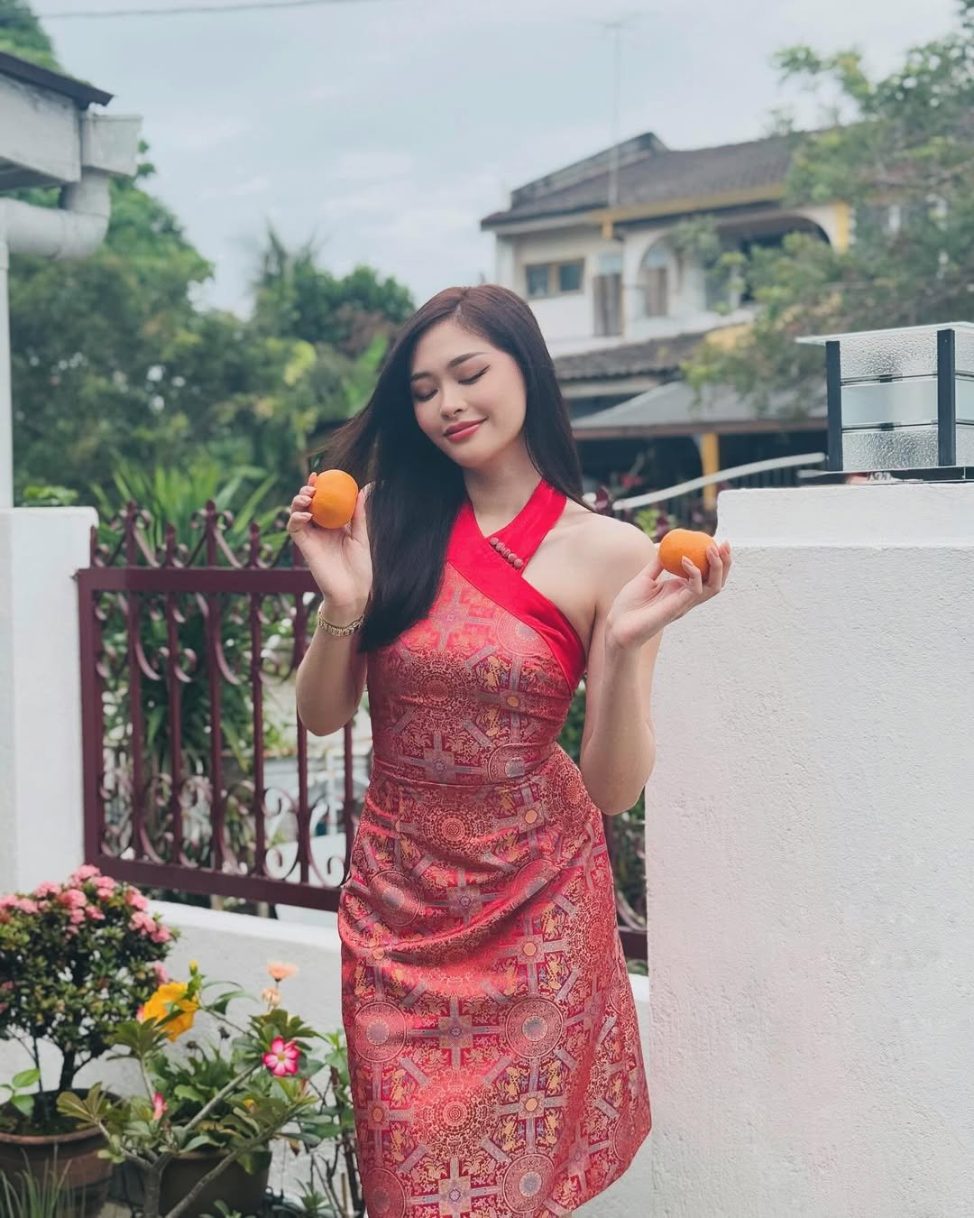 This look feels joyful in the most effortless way. The halter-style cut paired with rich red patterning brings a fresh, almost flirty energy to traditional festive dressing. And those mandarins? A subtle nod to luck that feels charming, not staged.