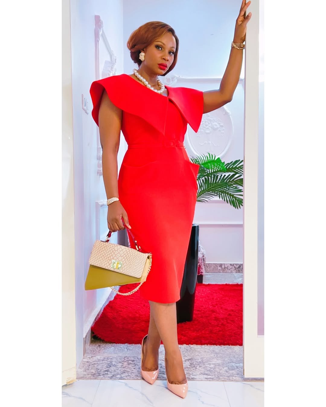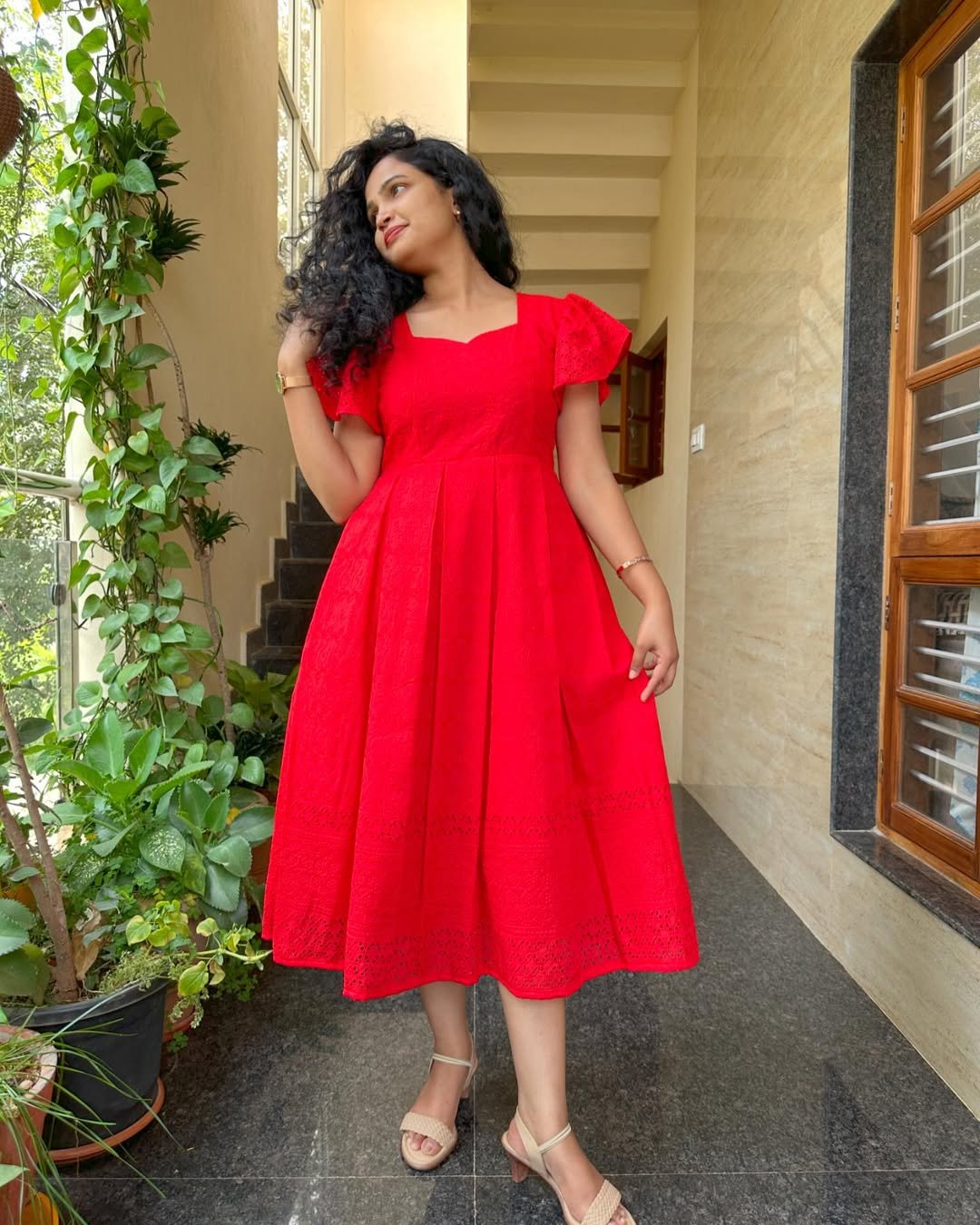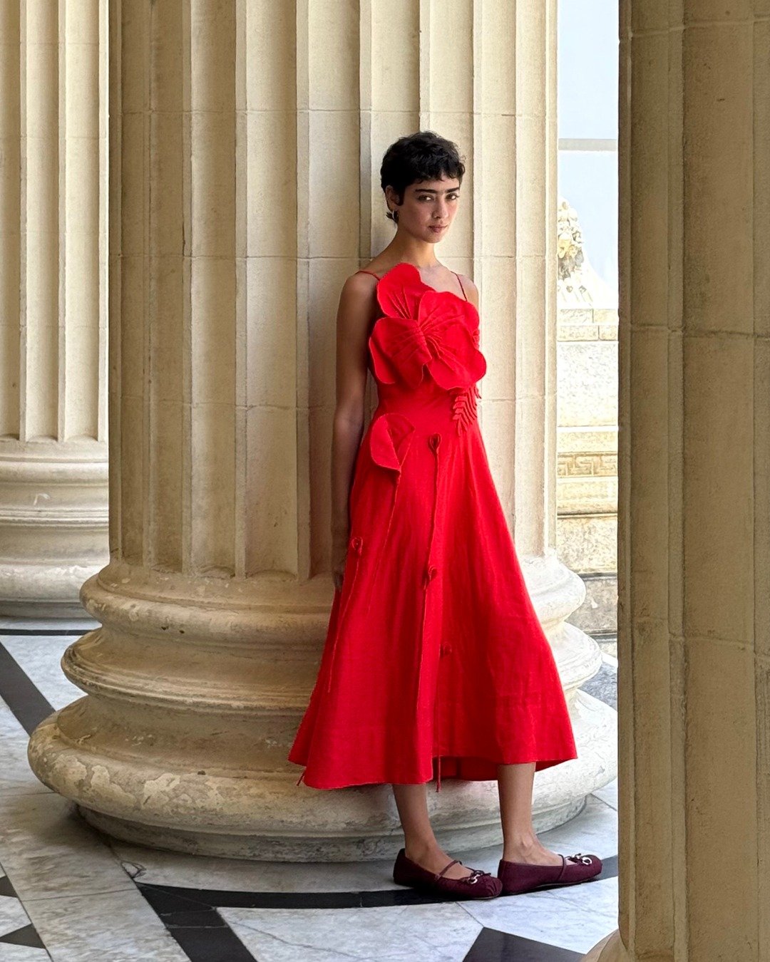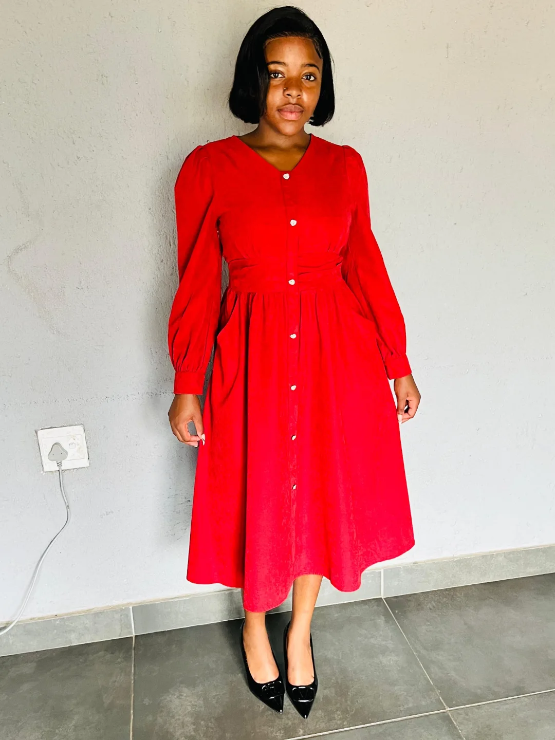 It’s the kind of red midi that commands respect—ideal for formal occasions or moments that call for confident femininity.