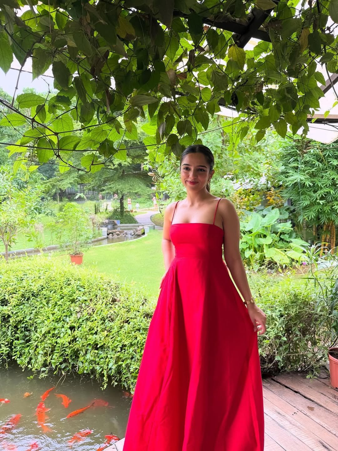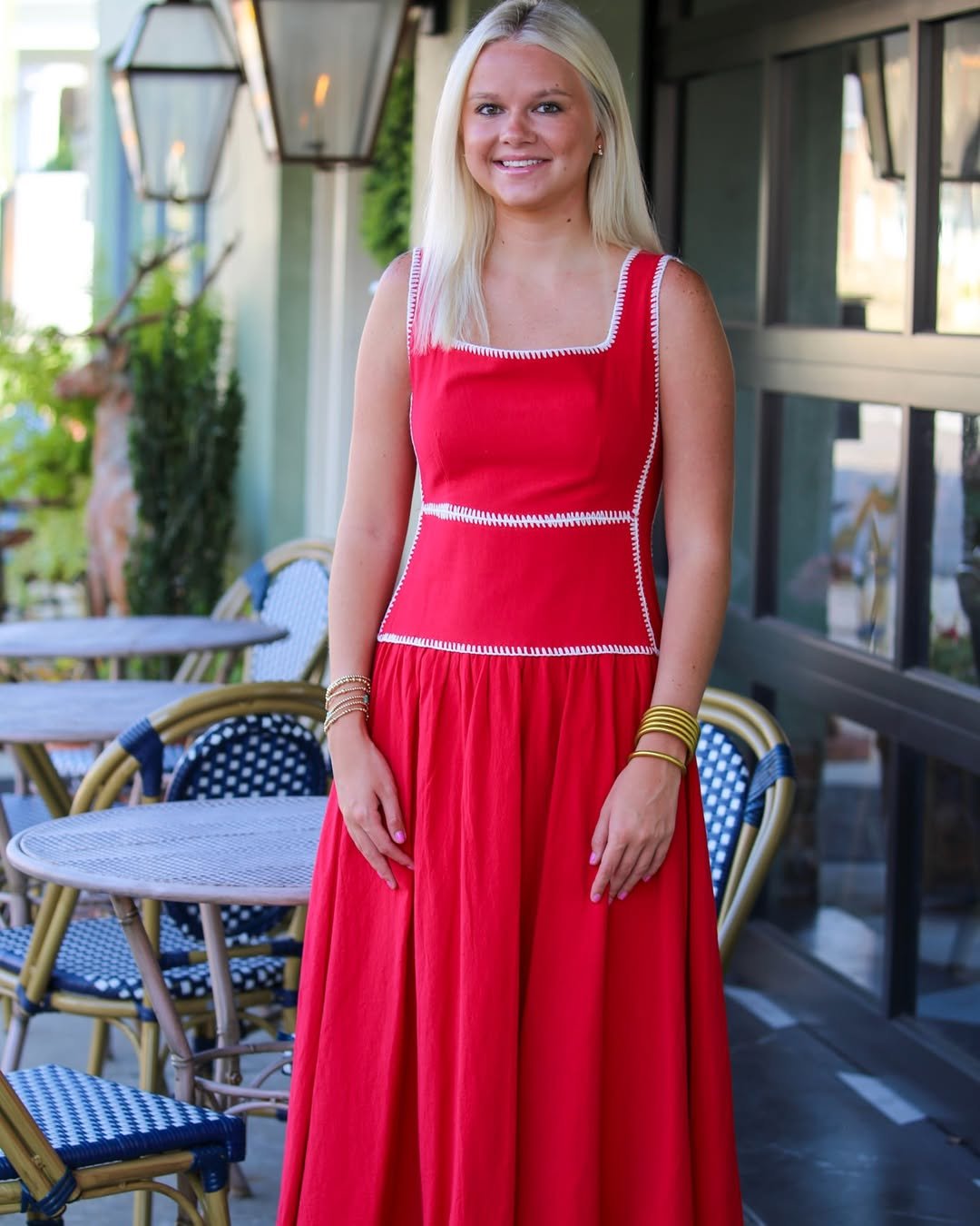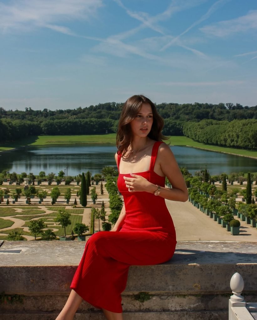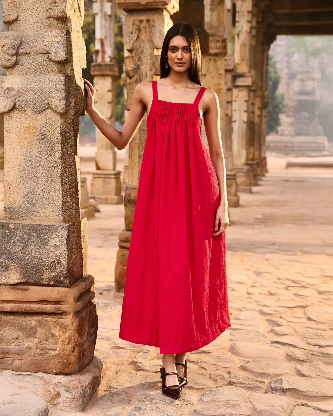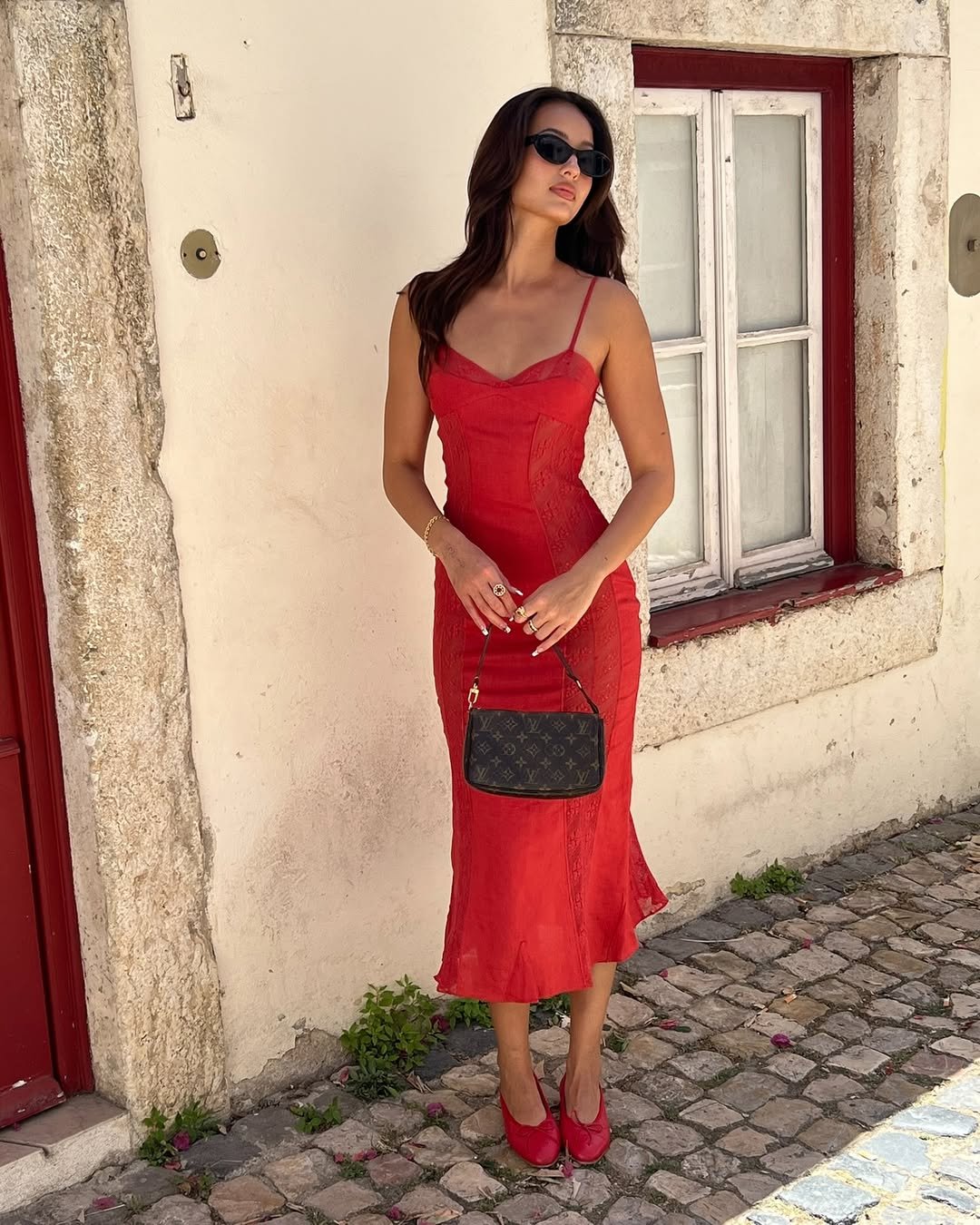 It’s the kind of dress that works across settings: dinner, events, even daytime with the right styling. Add gold jewelry, keep the lines clean, and let the red speak softly but confidently.