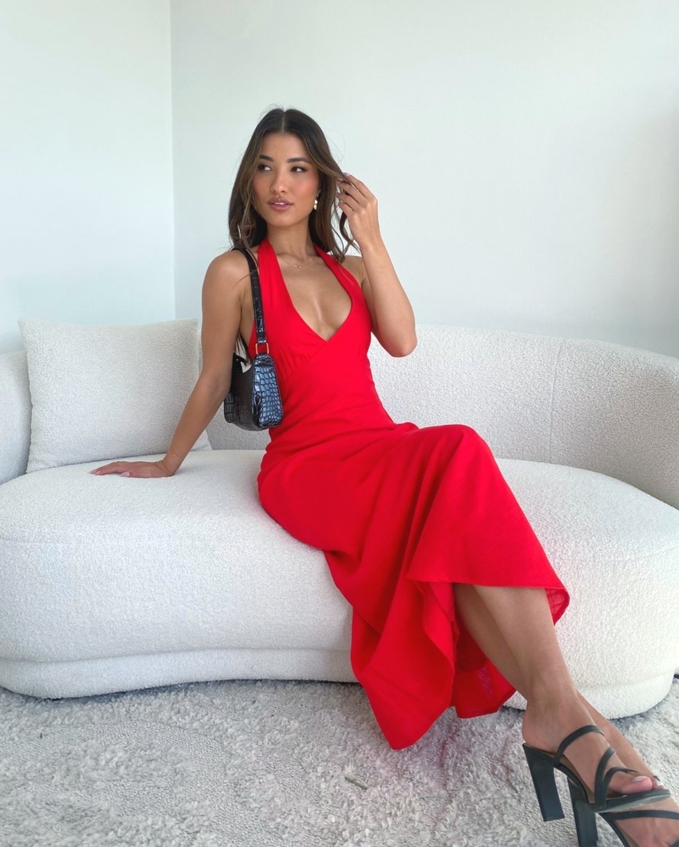 This red midi feels quietly confident. The clean halter neckline and fluid drape give it that “no extra effort required” elegance—simple, flattering, and timeless in the best way.