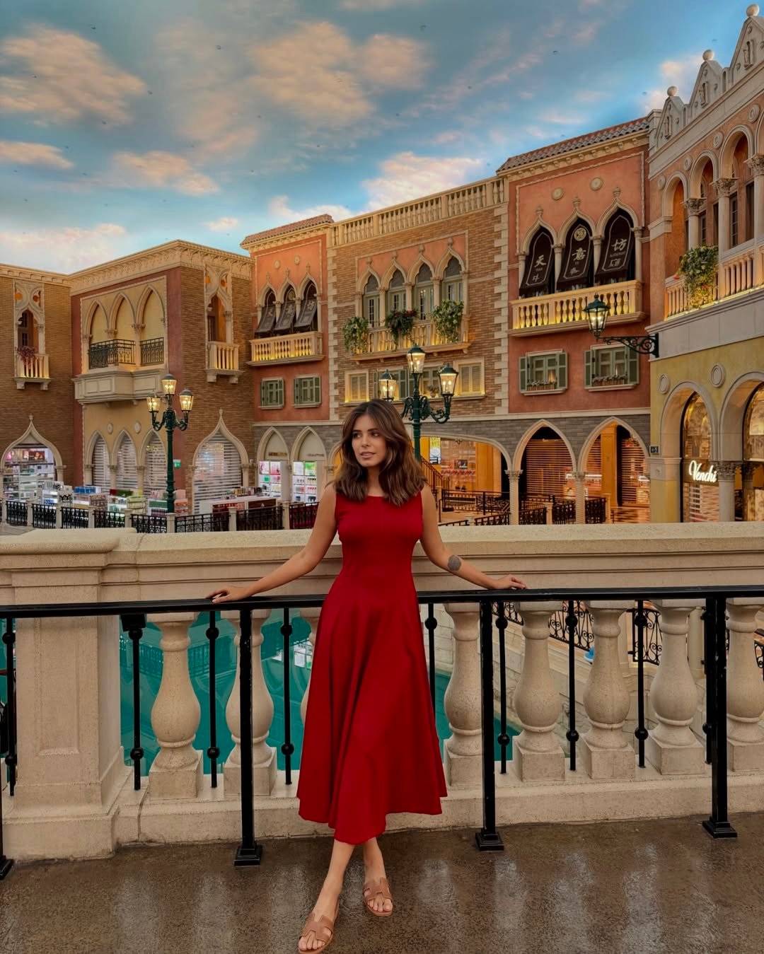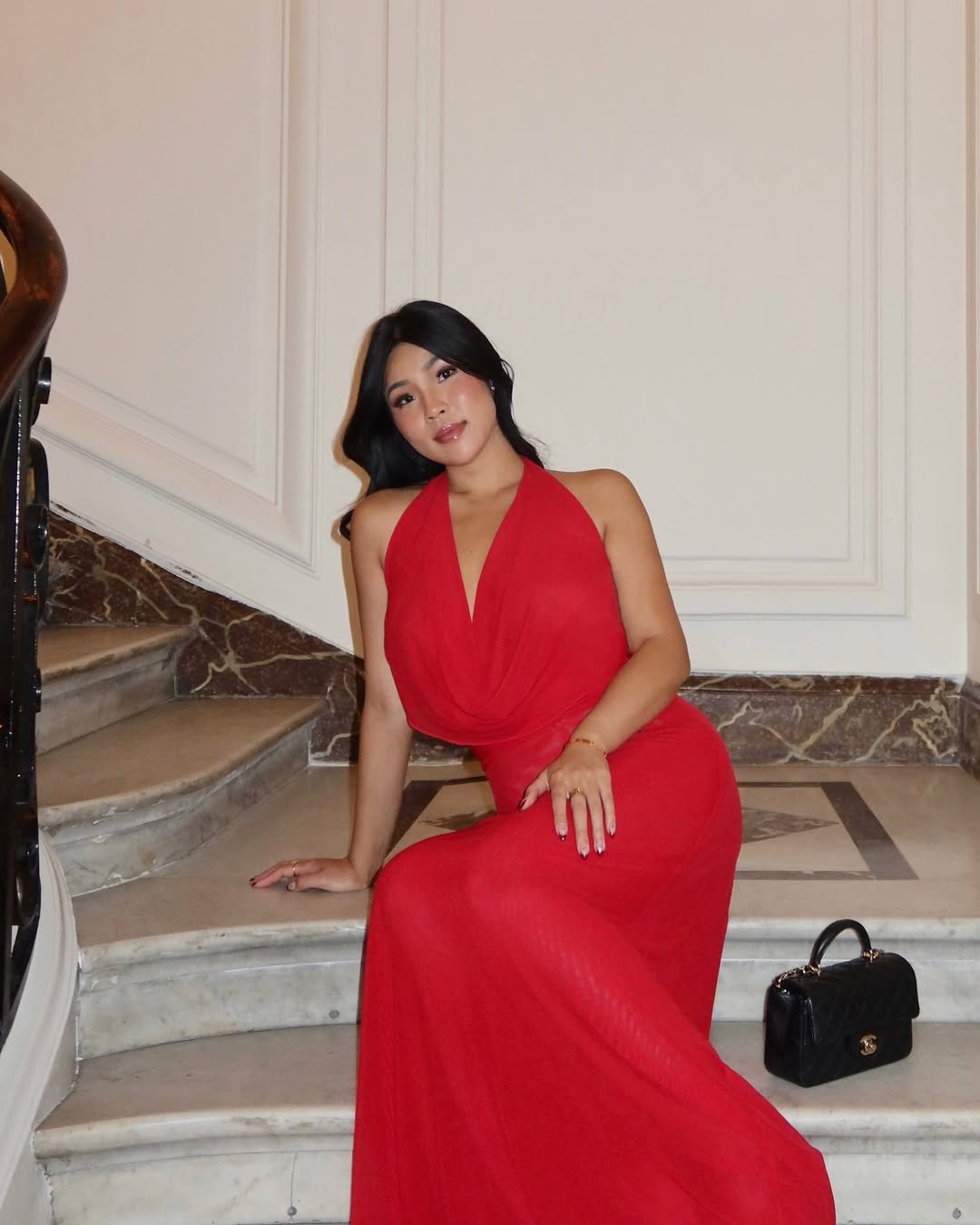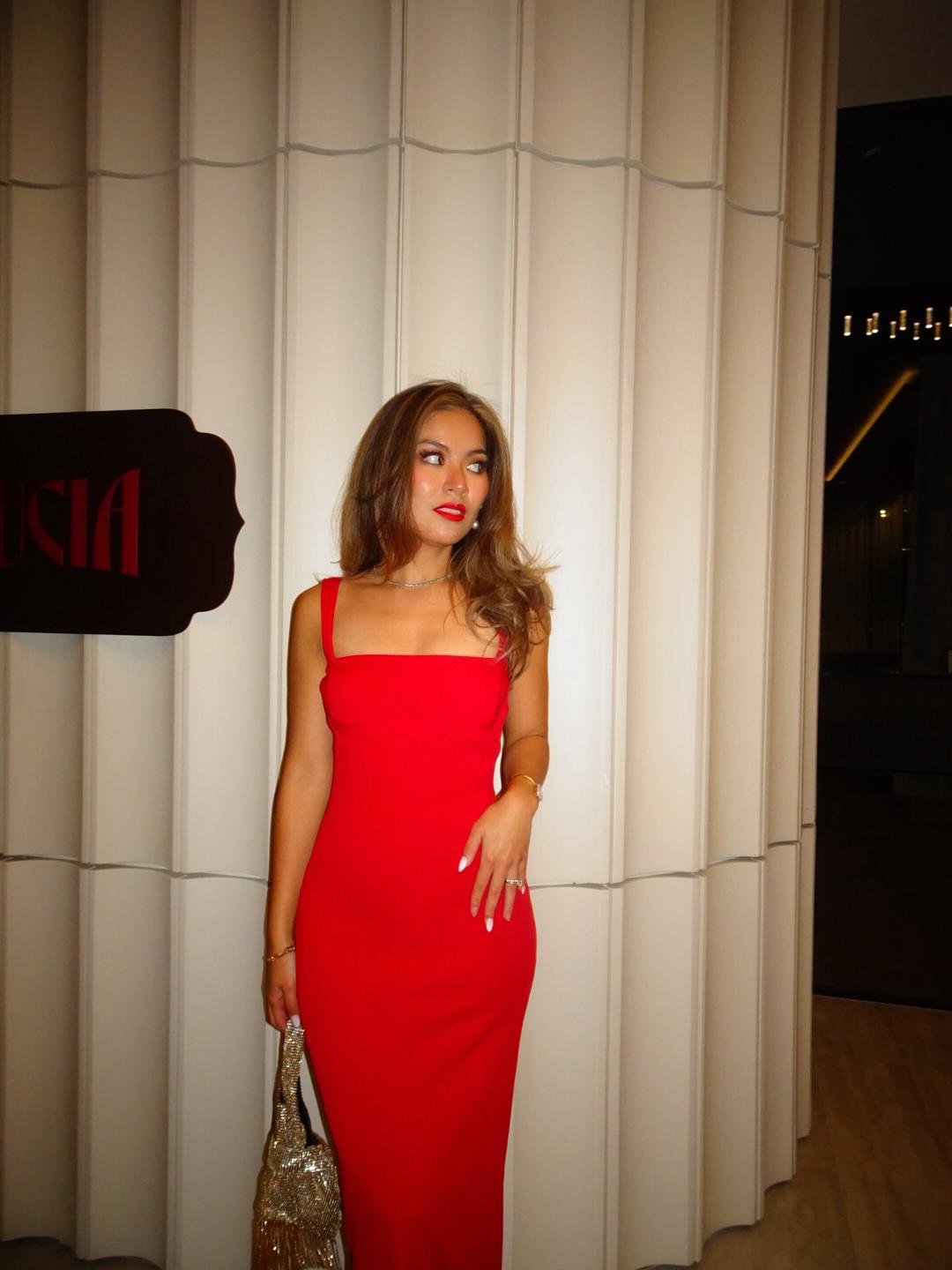 This is red dress drama done softly. The silhouette flows, the setting glows, and everything feels intentional yet relaxed. It’s glamorous, but not trying too hard.