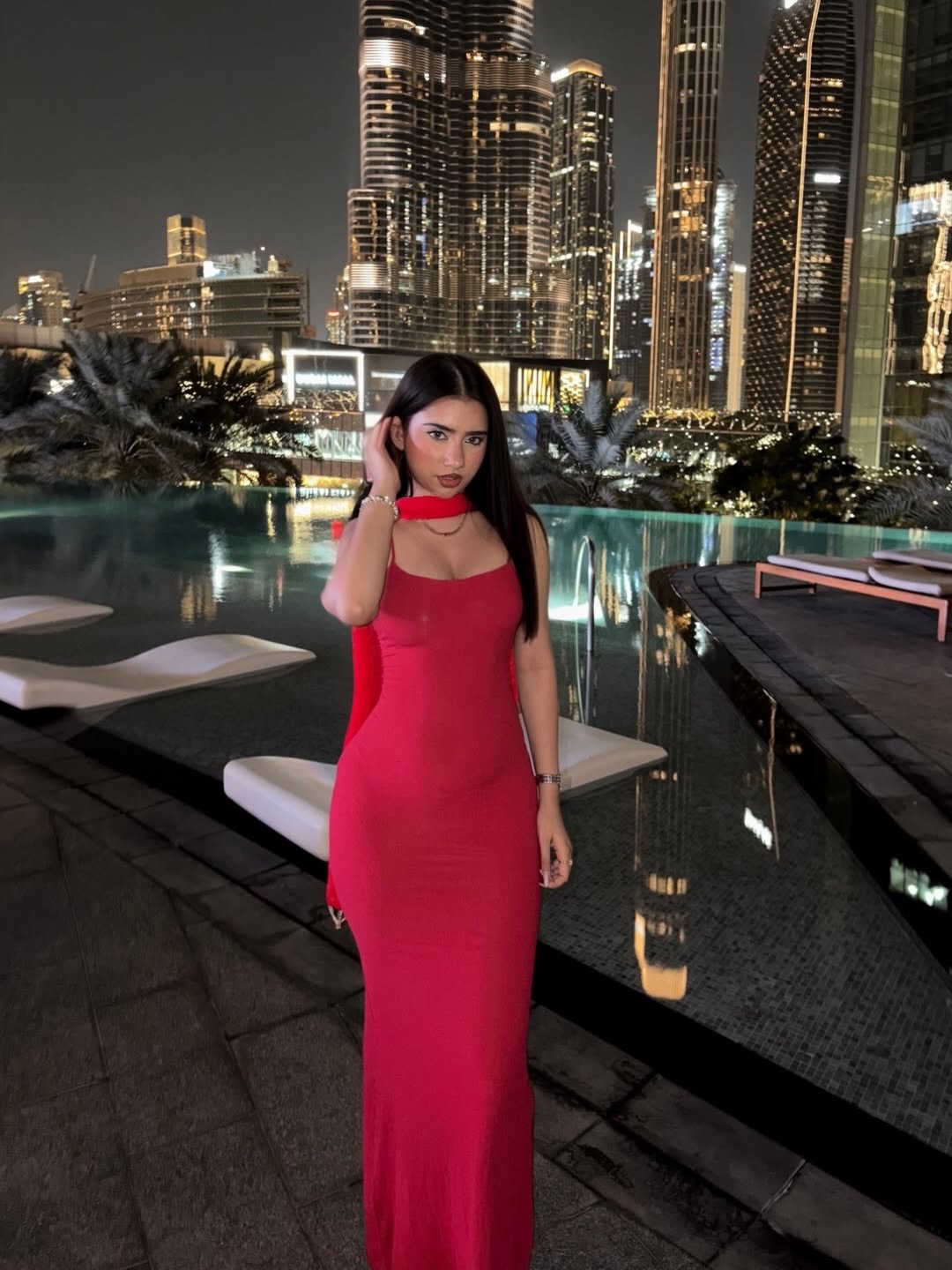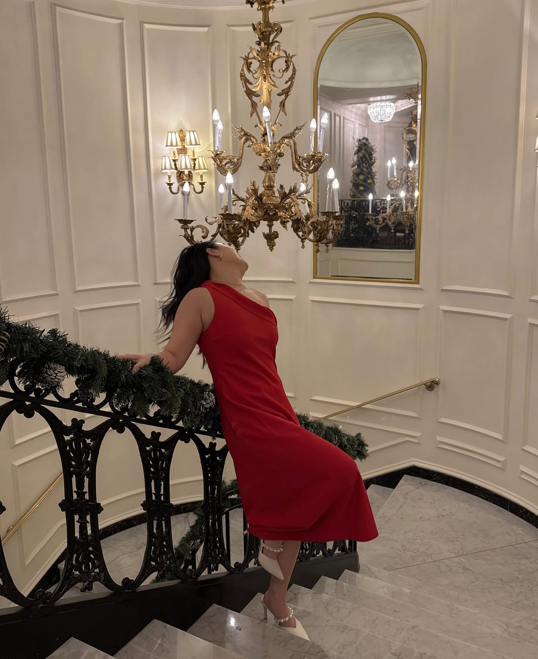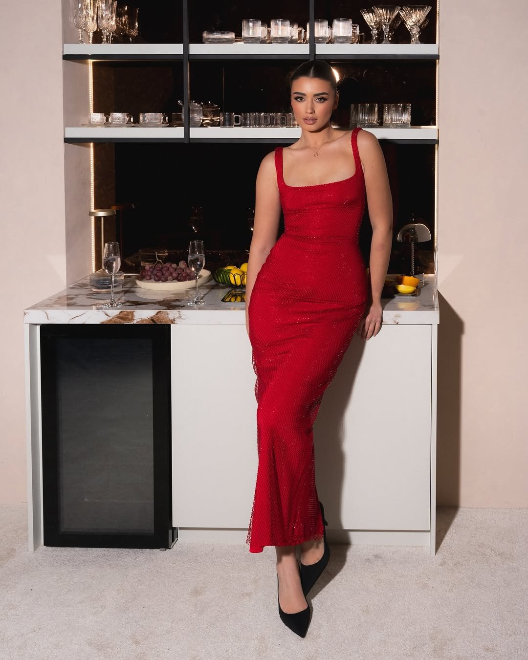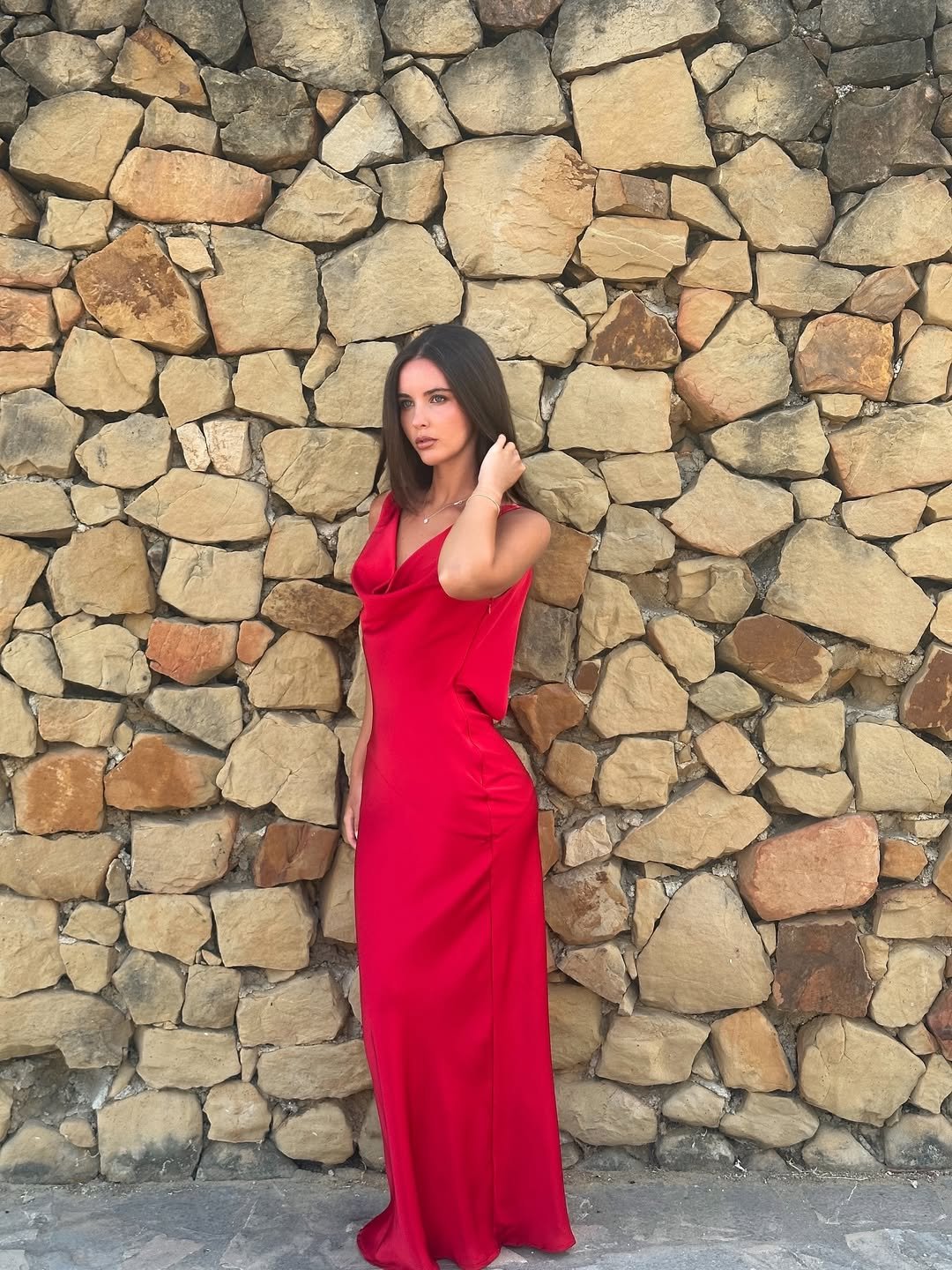 This is red dress drama done softly. The silhouette flows, the setting glows, and everything feels intentional yet relaxed. It’s glamorous, but not trying too hard.