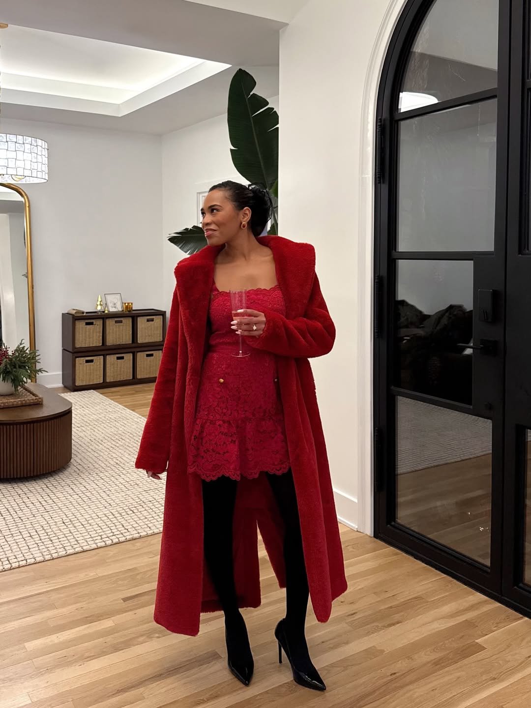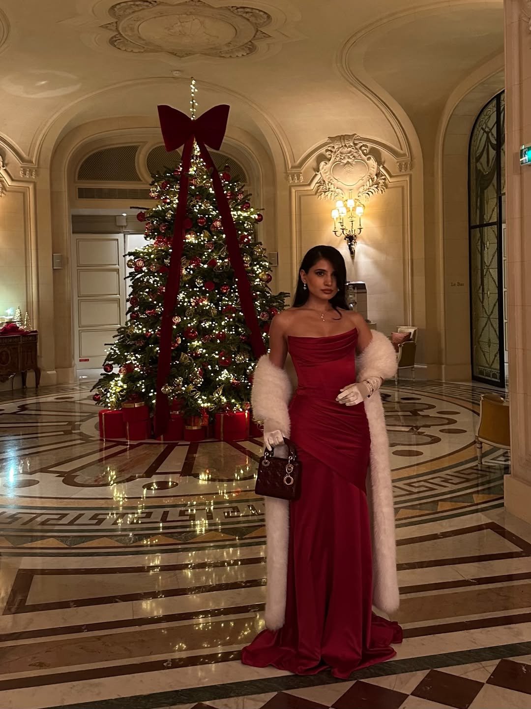 This scene feels straight out of a grand holiday evening. The rich red gown paired with plush textures and classic accessories gives it an heirloom-level elegance.