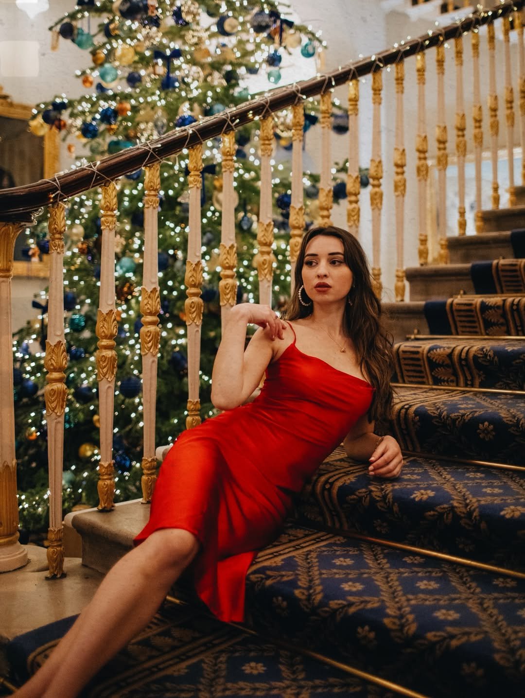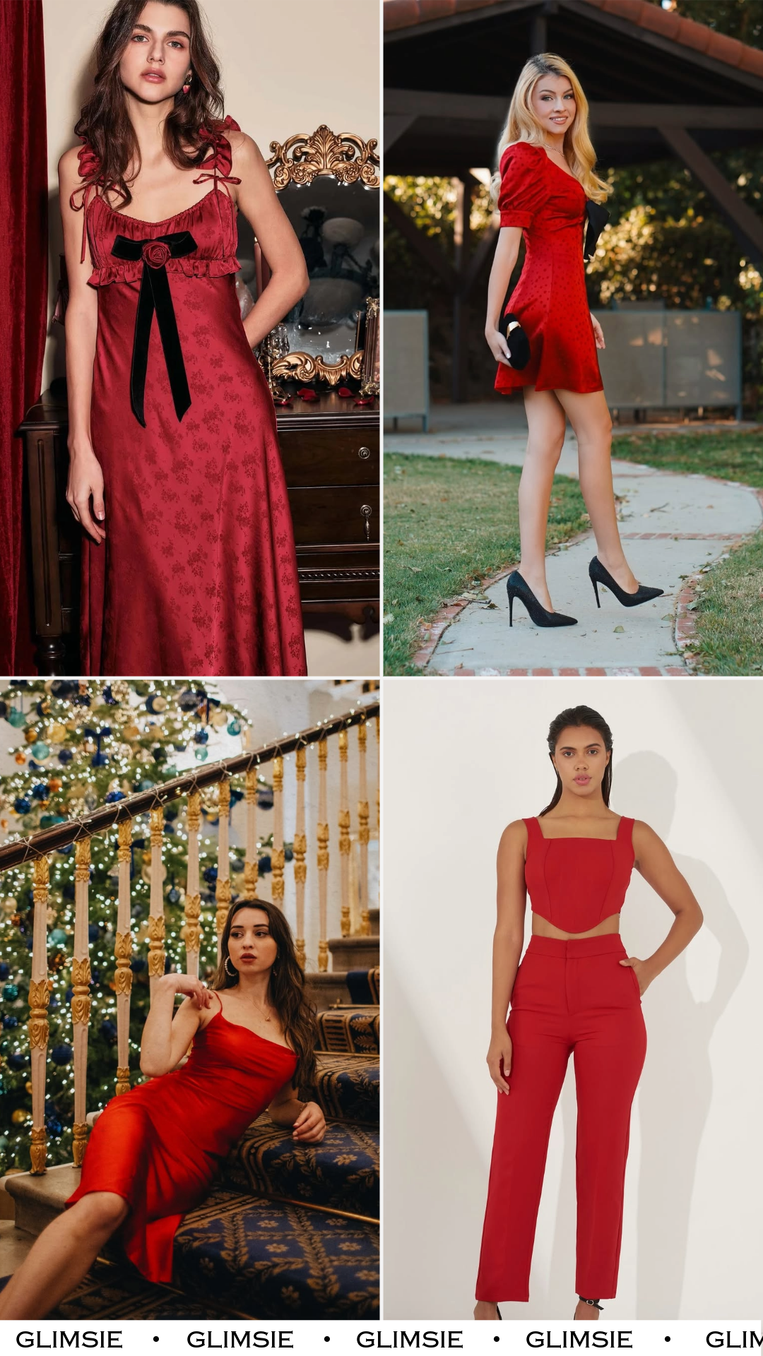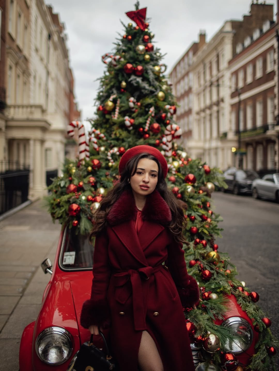 There’s something timeless about this one. Rich red tones layered with winter textures give it that old-Hollywood-meets-holiday feel, without tipping into costume territory.