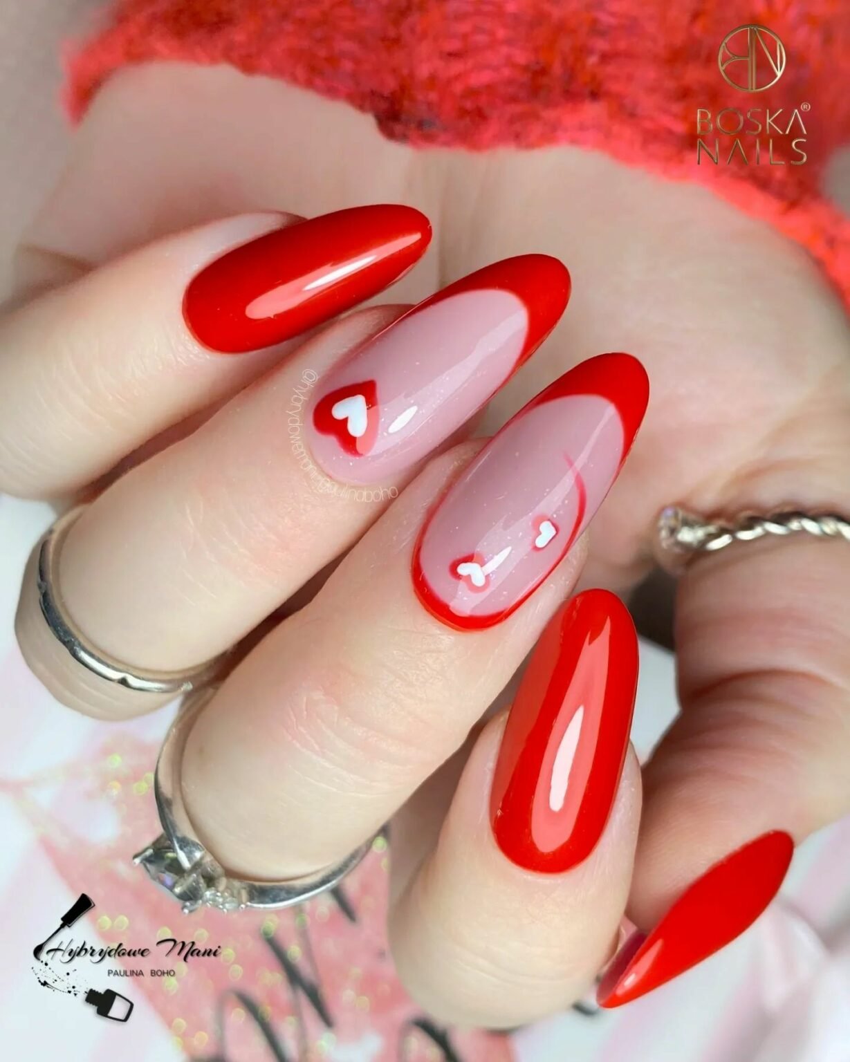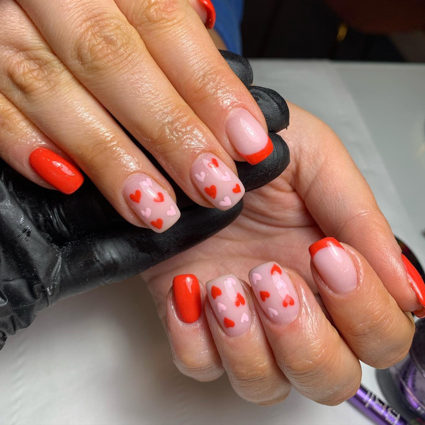 Soft pink bases covered in tiny red and pink hearts create the cutest sprinkle-effect — like candy hearts scattered across a table. The red French tips tie everything together, adding structure to the sweetness.