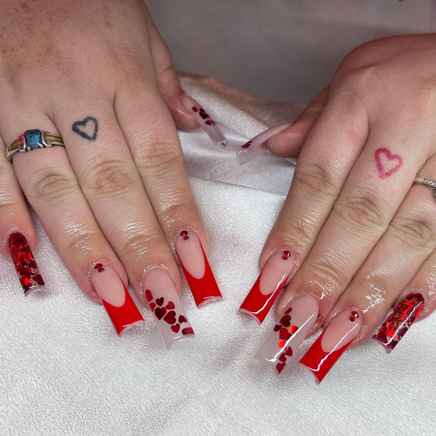 This set feels clean, polished, and beautifully intentional. The bright red French tips give instant Valentine energy, but the scattered red hearts and sparkly crushed-foil accents take it somewhere extra sweet. Everything is glossy, sculpted, and so satisfyingly symmetrical.